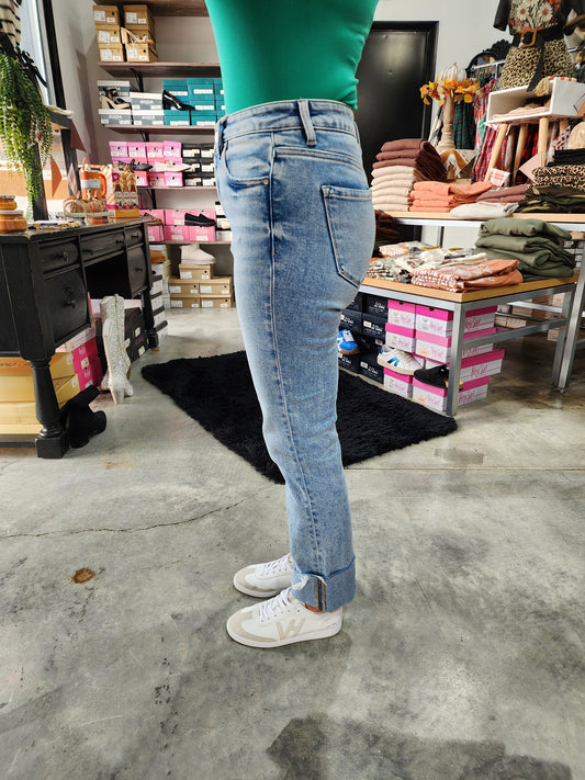 Judy Blue Mid Rise Plaid Print Cuff Boyfriend Denim Jeans