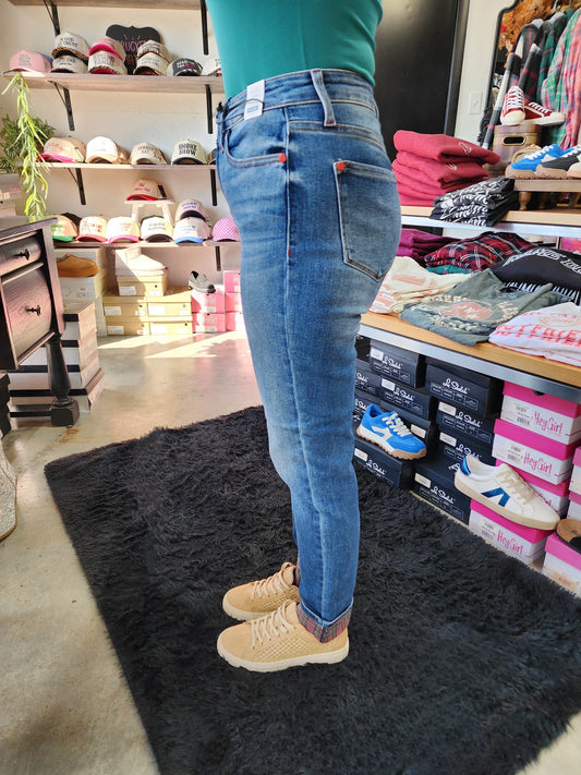 Judy Blue Mid Rise Plaid Print Cuff Boyfriend Denim Jeans