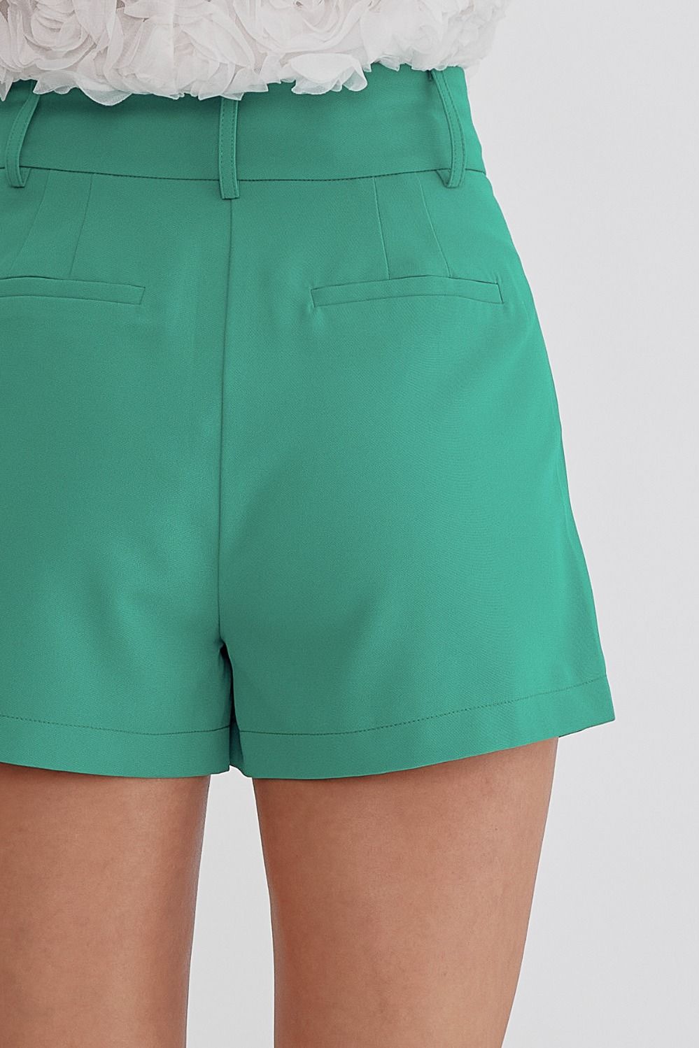 Introducing our Anything Goes Pleated Shorts! These high-waisted shorts, with their button and zipper closure, pockets, and belted loops, are perfect for any occasion. Dress it up or keep it casual - it's up to you! Available in black and kelly green, these woven and lined shorts are non-sheer and lightweight.