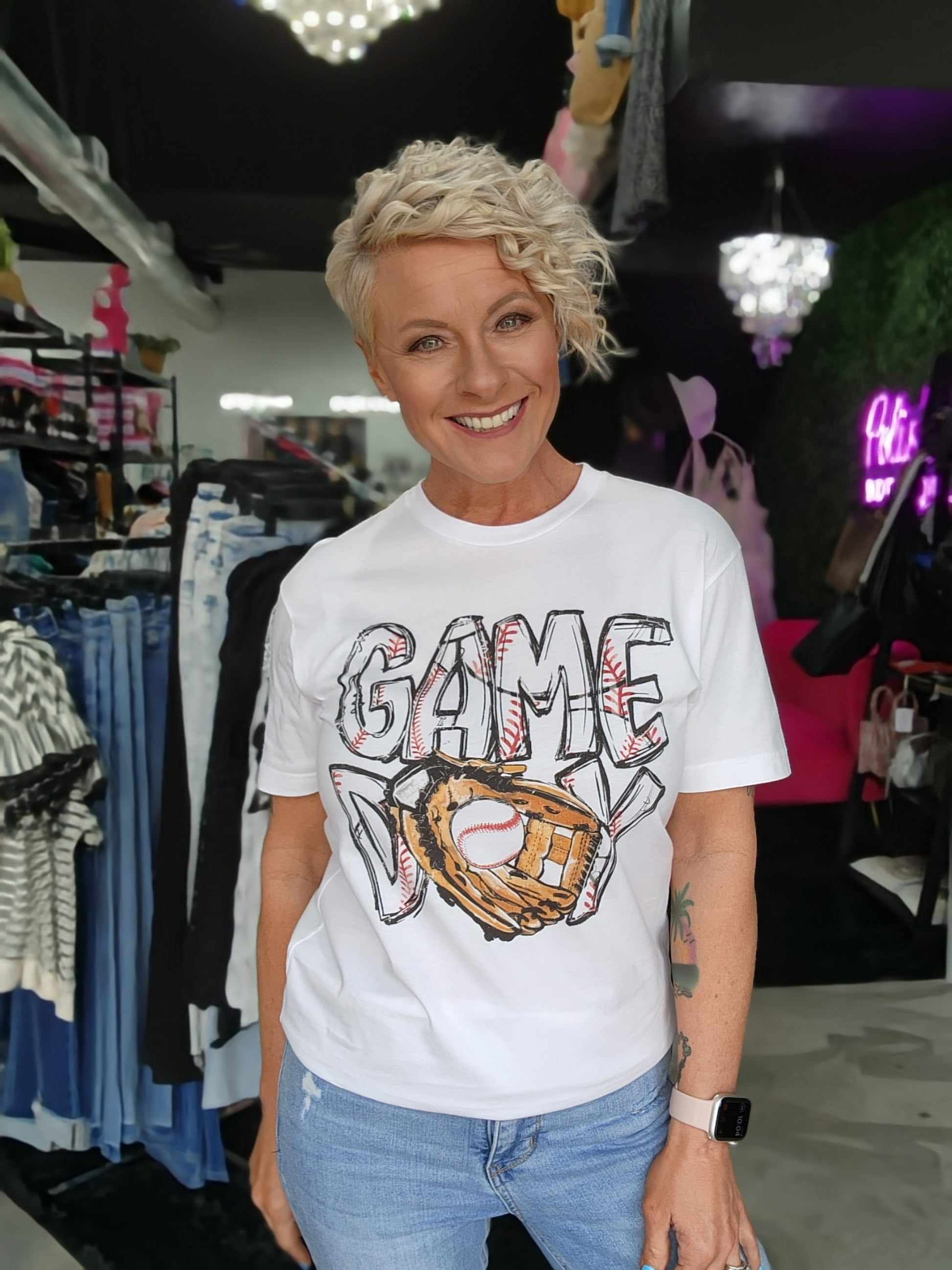 Get ready for game day with this playful white tee featuring a baseball glove graphic and "game day" in bold black lettering. Perfect for any baseball fan, this shirt will add some fun and personality to your game day outfit.
