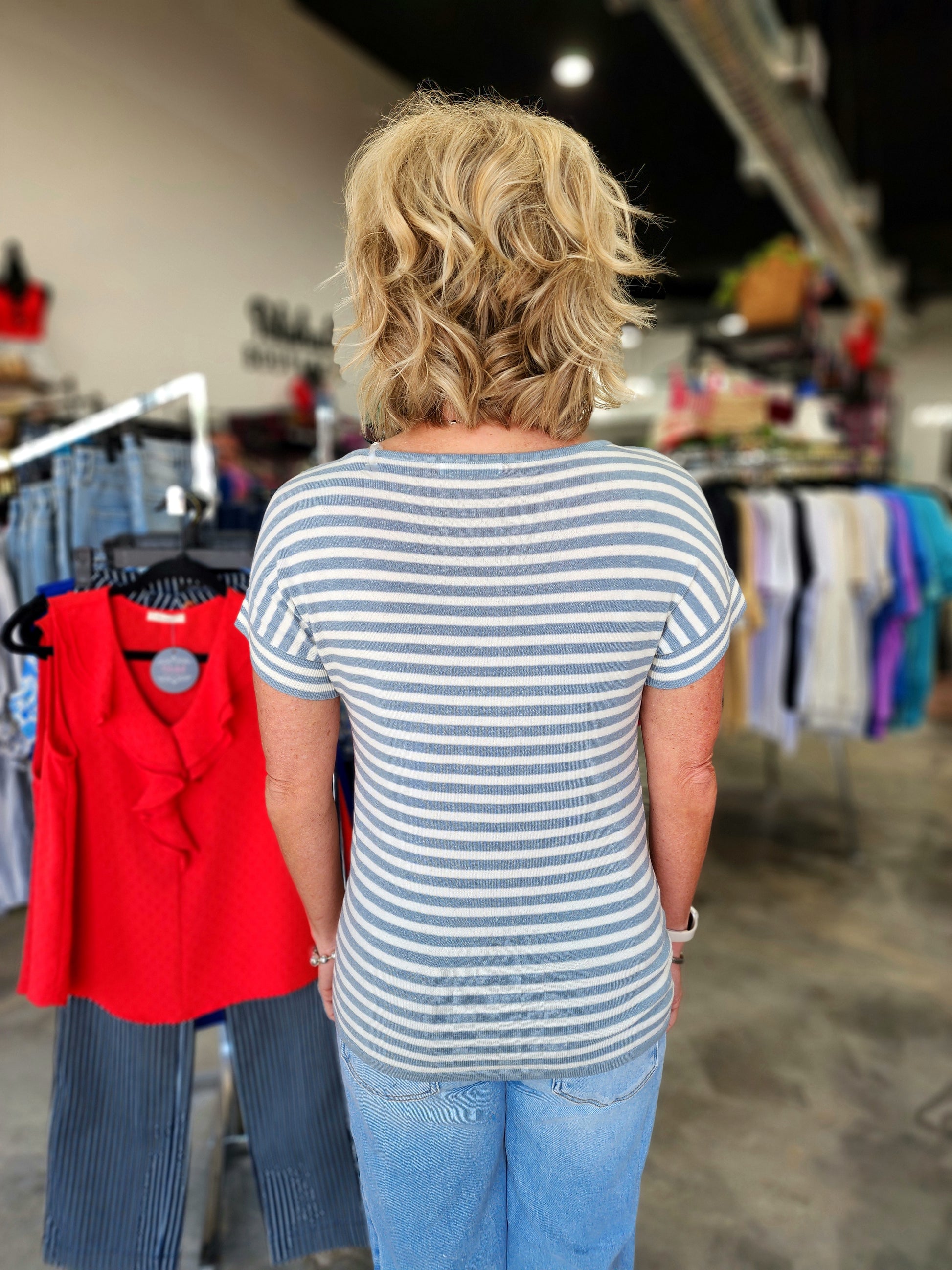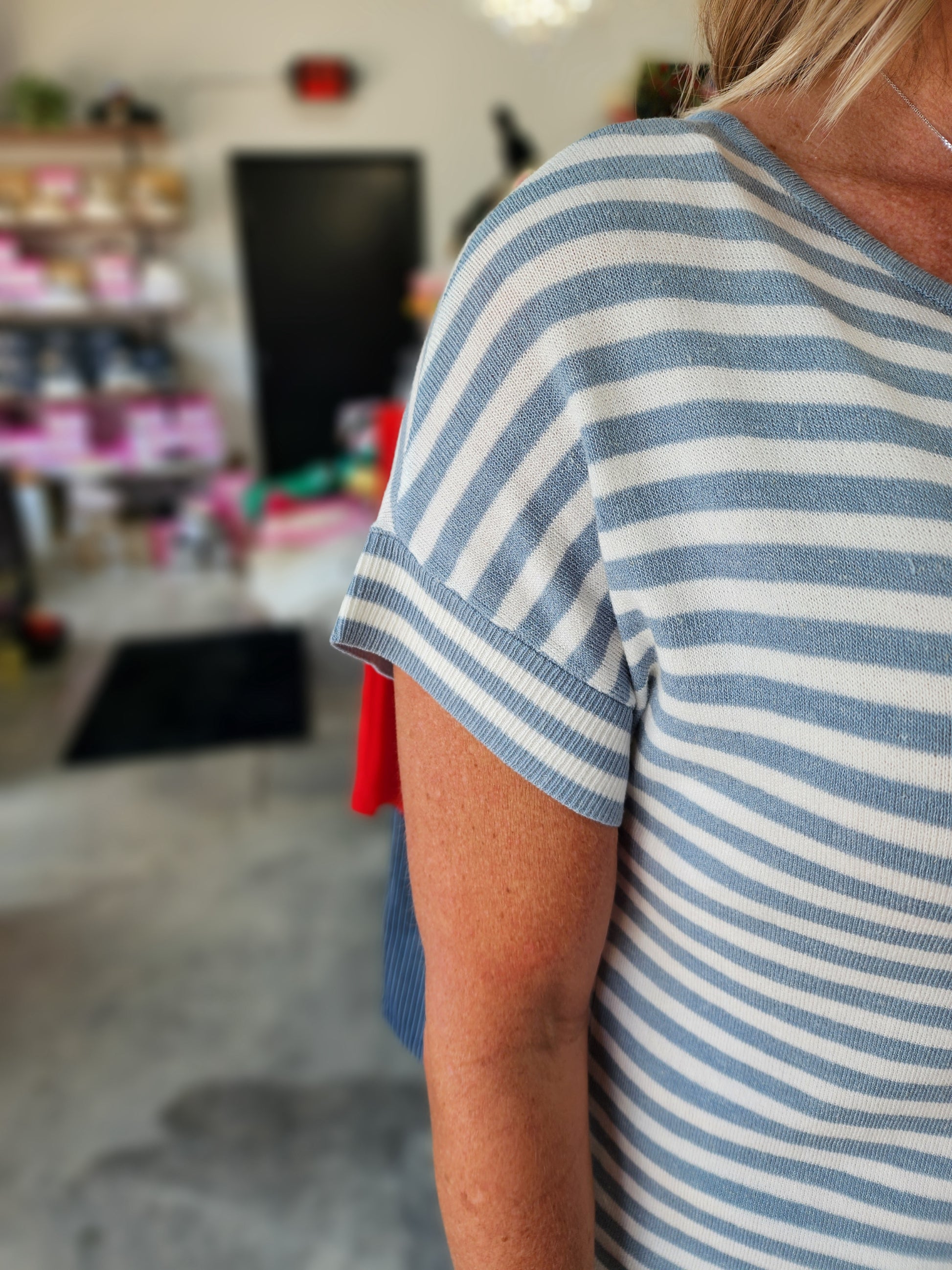 The Blue Haze Short Sleeve Sweater in dusty blue with white stripes offers a fresh, stylish look. Its wide crew neck adds comfort and a modern touch, perfect for pairing with jeans or white shorts. This sweater effortlessly blends casual ease with chic design, making it a must-have for your wardrobe.