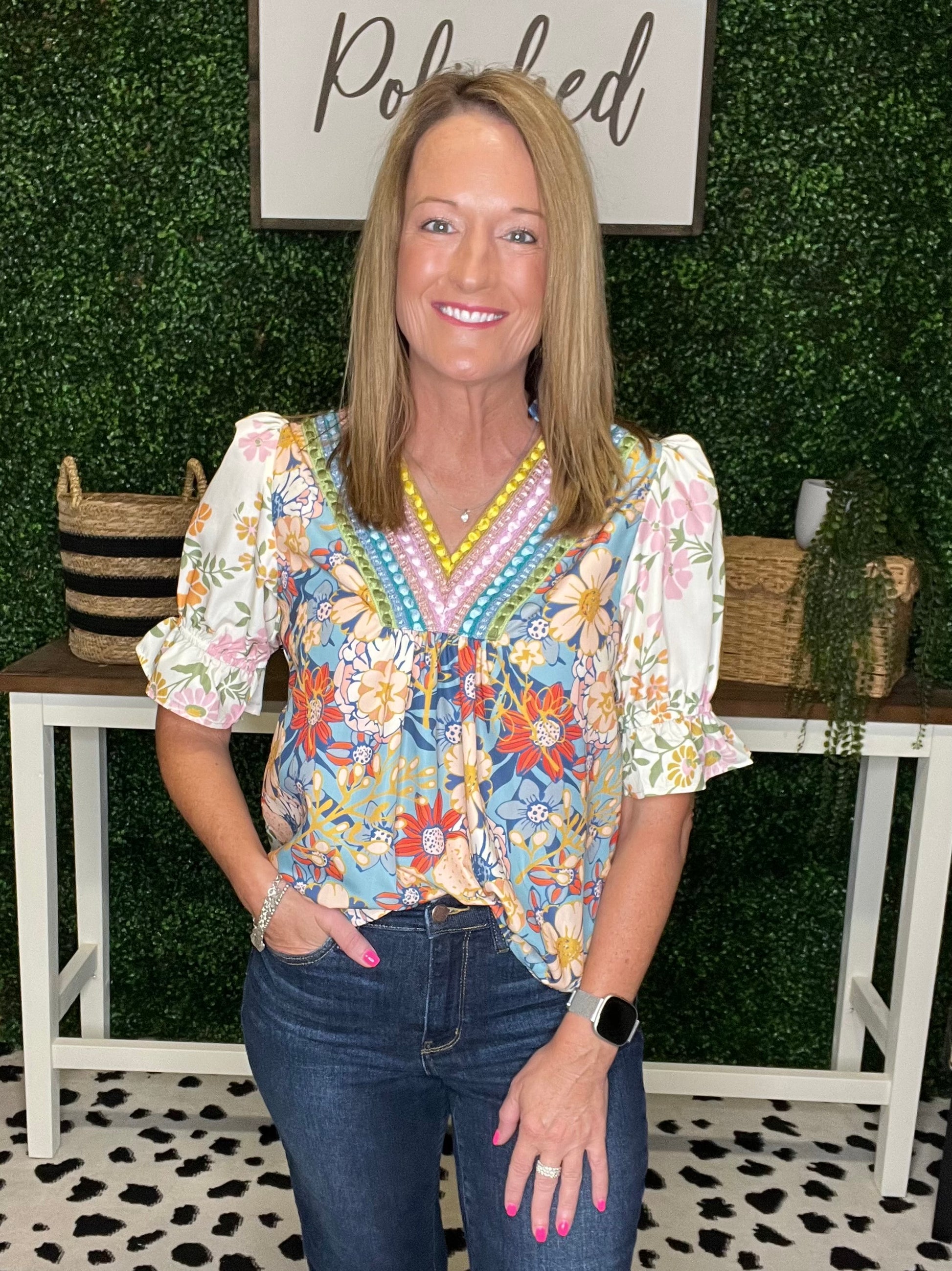 This Boho Floral Blouse features two beautiful floral designs that bring a fresh, vibrant look to your wardrobe. With a comfortable v-neck and 3/4 length sleeves, it’s designed to keep you feeling confident all day. The colorful crochet neckline adds a lovely handmade touch, making it perfect for both work and special occasions. Embrace your style with this versatile and charming top.