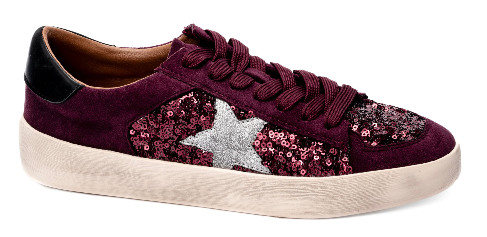 Complete your look with Corky's Another Round Sequin Sneakers from Hey Girl by Corkys. Wine sequins with a silver star on the side give these fun and lightweight sneakers a playful touch. Perfect for a night out or a day of running around town.