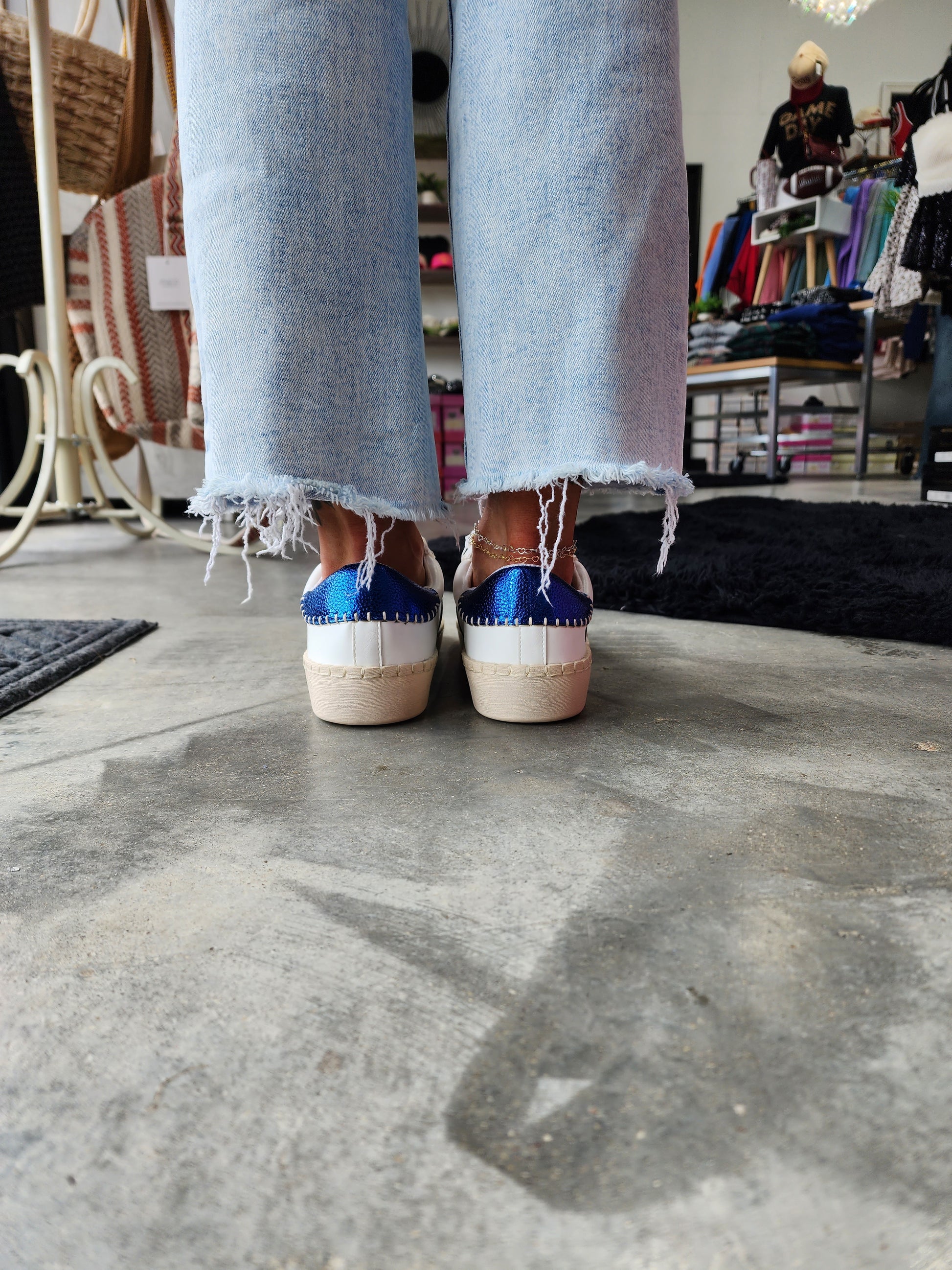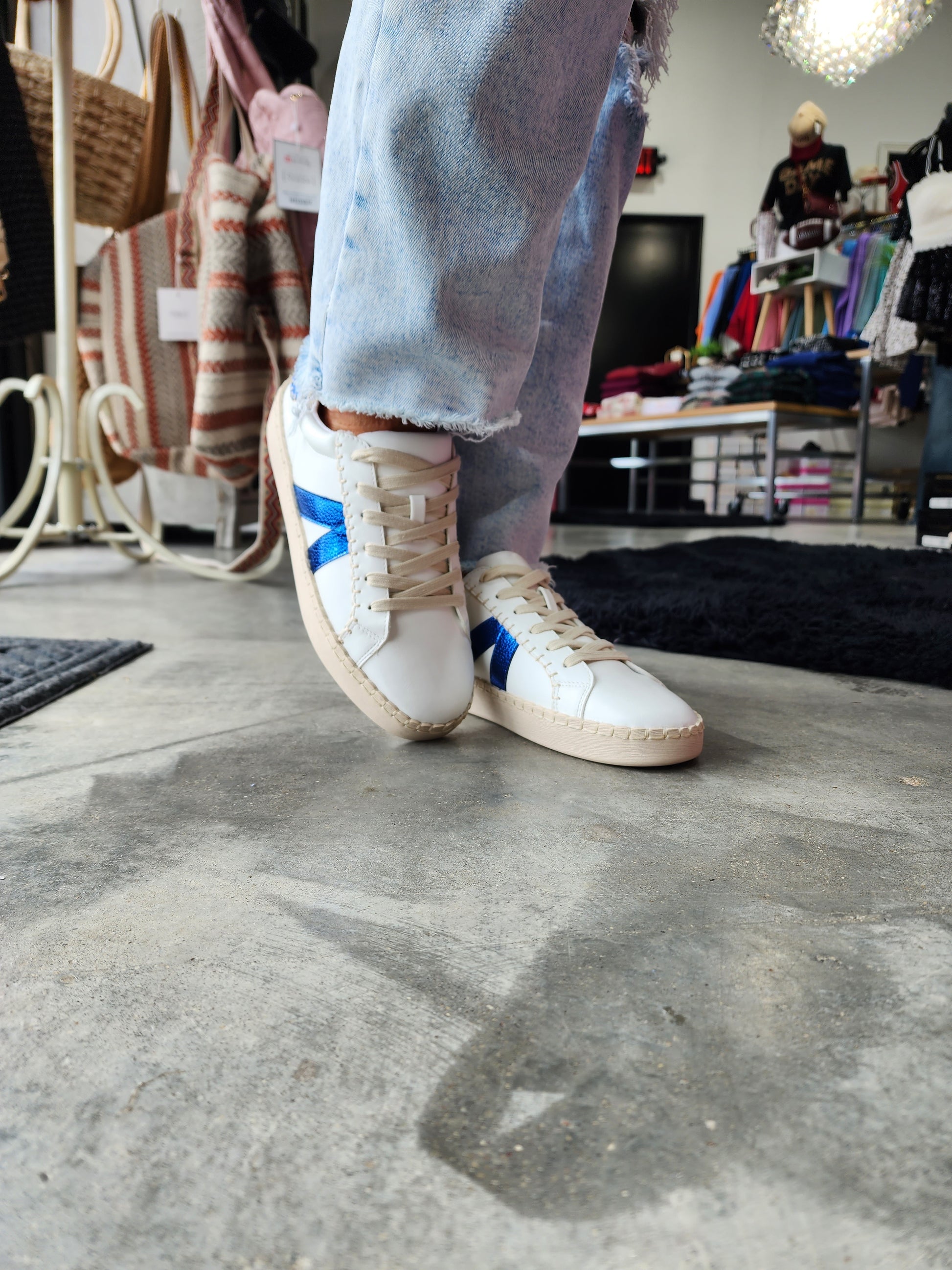 Step out in style with Corky's White/Blue Friend Zone Sneakers! These playful kicks combine crisp white faux leather with dazzling blue metallic accents for a look that pops. Enjoy all-day comfort thanks to a cushioned insole and secure lace-up fit with charming stitched sole details. Perfect for errands, weekend fun, or adding sporty flair to your athleisure wardrobe. True to size, but if you’re in between, go up a size and get ready to shine.