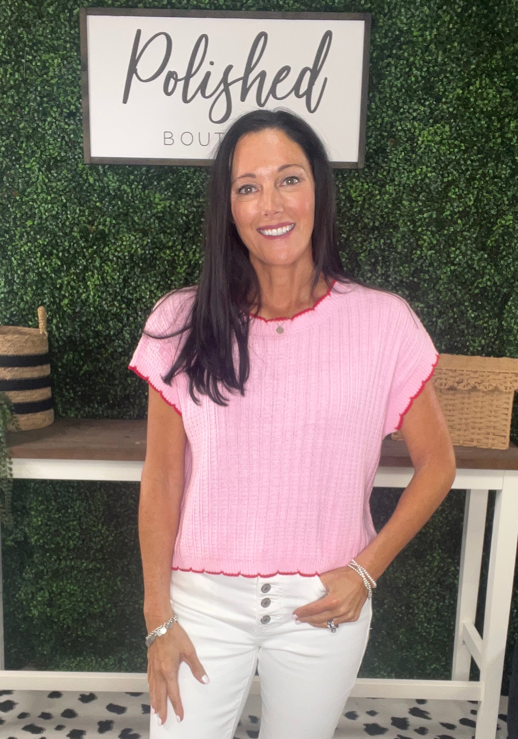 Introducing Cupid's Sweater, the perfect addition to your wardrobe! This sweater features a textured design, wide short sleeves, and a contrast scalloped edge, making it versatile for dressing up or down. With its cute and fun trendy style, you'll be sure to make a statement wherever you go. Upgrade your fashion game with Cupid's Sweater today!