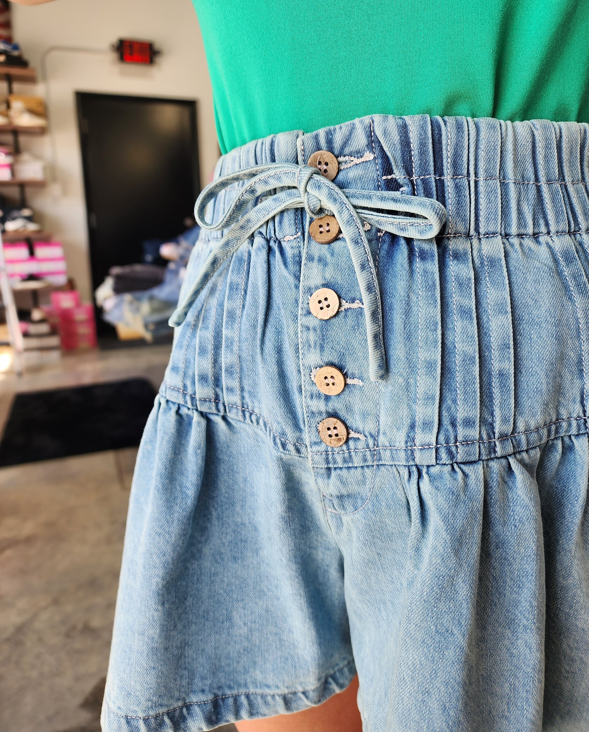 Get ready to rock these flared denim shorts! With an elastic waist and drawstrings, they offer both style and comfort. Plus, the button up design and back pockets add extra flair. Perfect for any occasion.