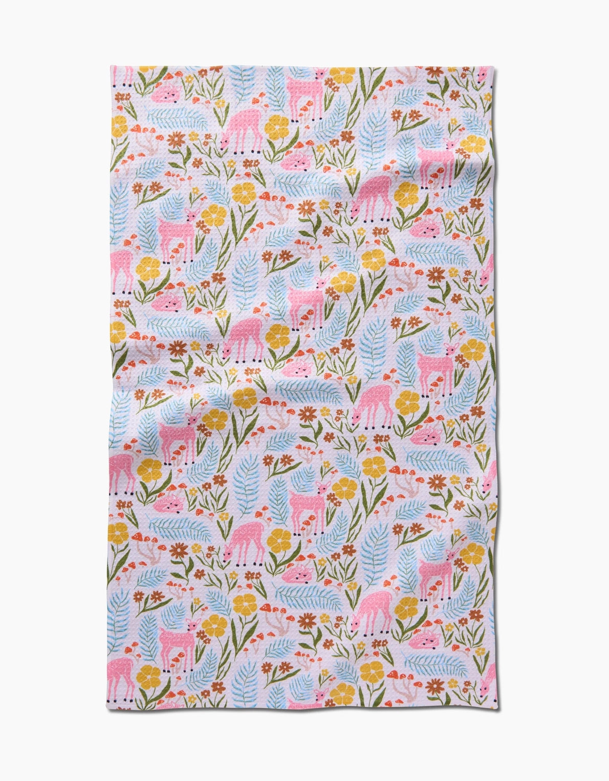 Upgrade your kitchen with our Geometry - Fern and Fawn Tea Towel. Made from recycled polyester, this 18" x 30" towel offers superior cleaning and next-level absorbency thanks to its waffle weave construction. Hang loop and quick-drying fabric make it both cute and practical. Elevate your tea time in style!