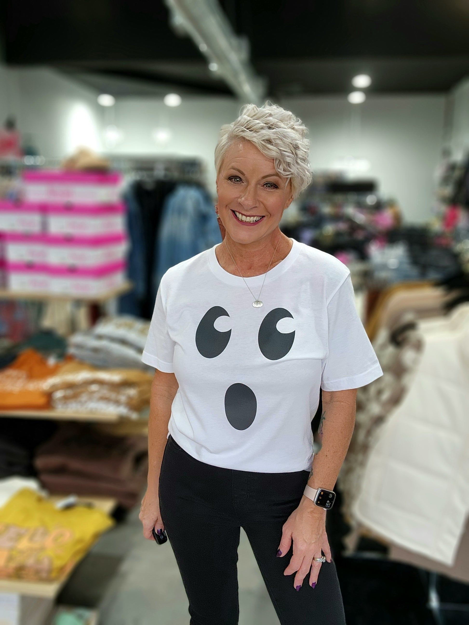This Halloween, get spooky and stay comfy with this ghostly graphic tee! Featuring a simple, yet cute graphic, this soft shirt is perfect for hauntingly stylish days.