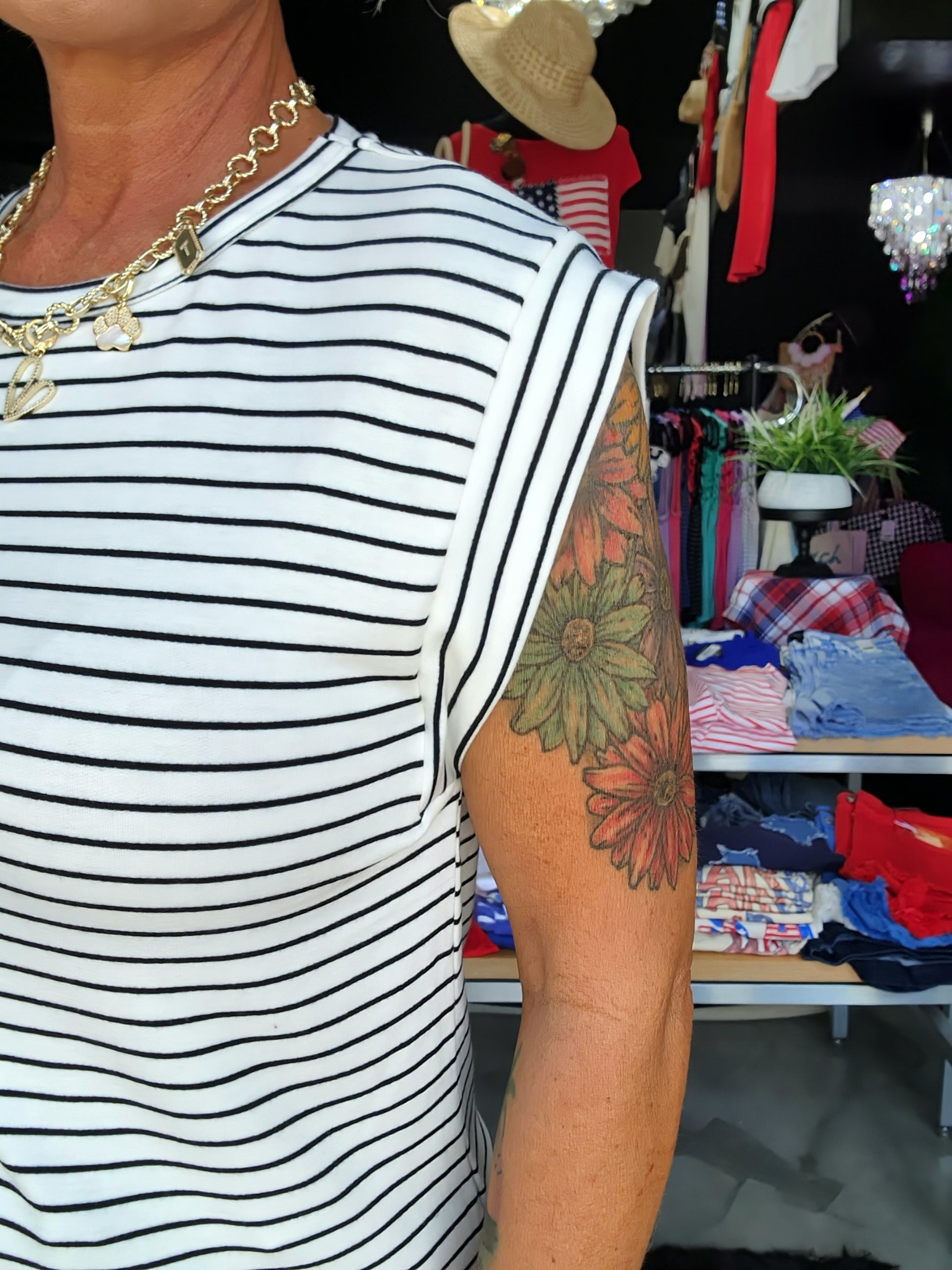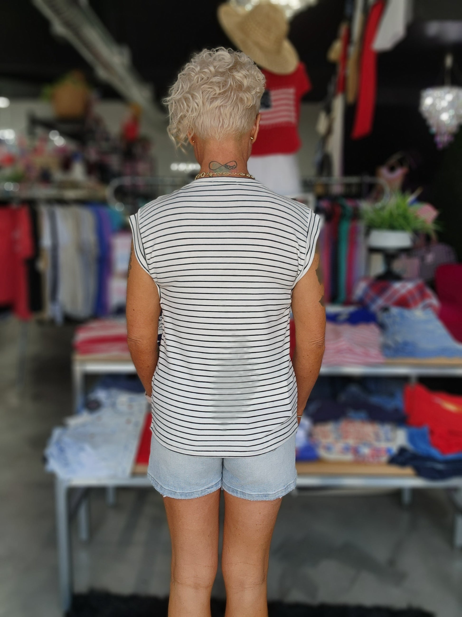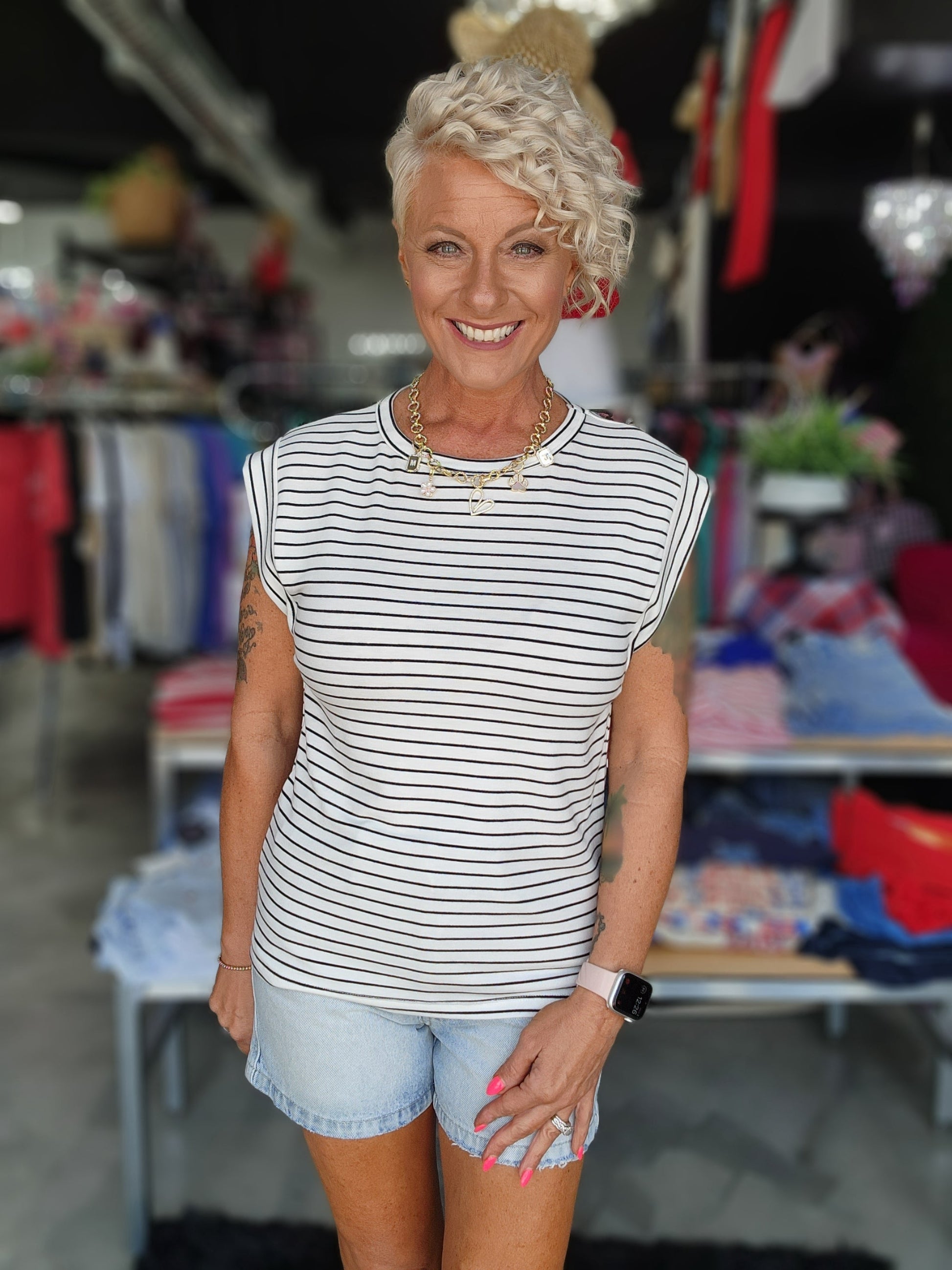 Experience effortless style with the In Between The Lines Top. Made from soft French terry, this white crew neck shirt features striking black stripes and short sleeves for a fresh, modern look. Its breathable fabric keeps you comfortable all day, while the classic design pairs perfectly with any outfit.