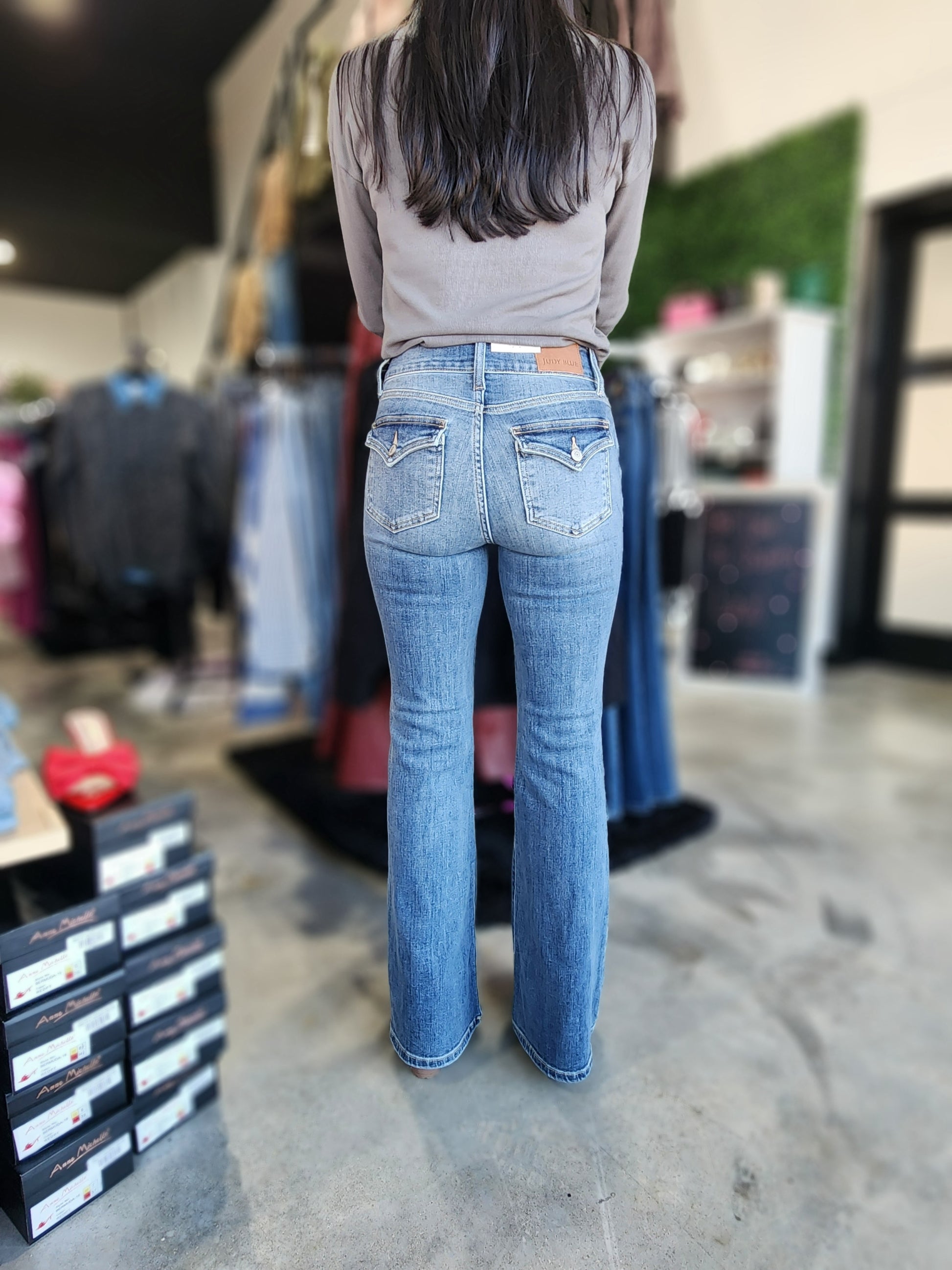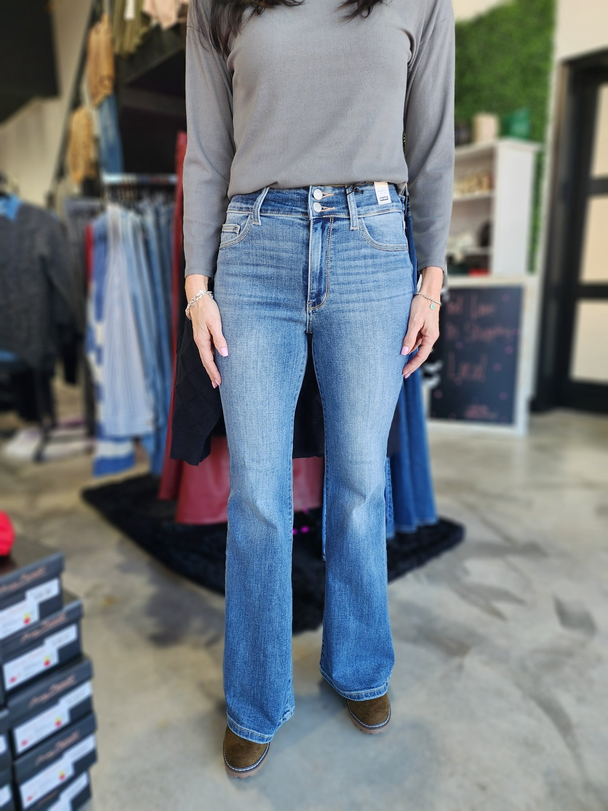 Get ready to turn heads in our Judy Blue High Waist Flare Denim Jeans! These medium blue denim jeans feature a flattering high waist and a trendy flare style leg. The double button adds a unique touch to these must-have jeans.