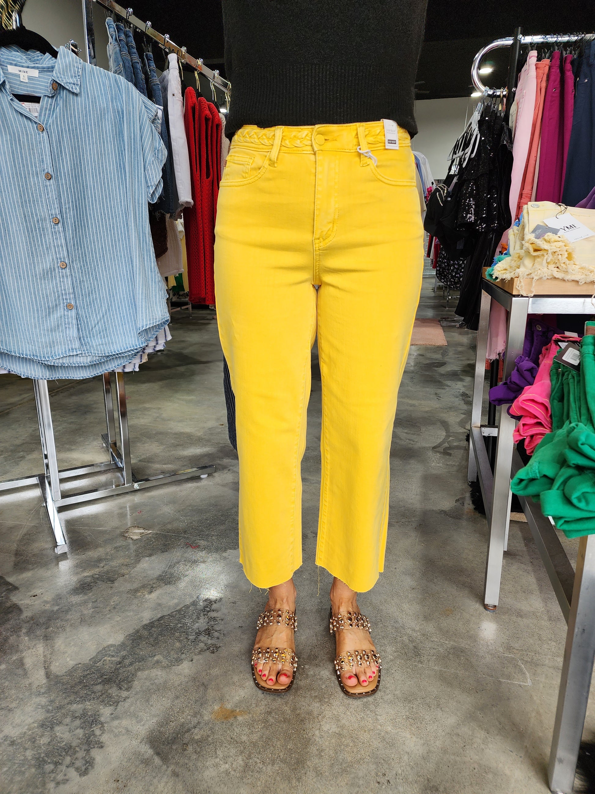Strut your stuff in these sassy Judy Blue high-waisted wide cropped jeans! The yellow denim brings the drama while the braided waistband give classy vibes. With a playful wide leg silhouette and cropped length, these jeans are ready to show off your favorite kicks!