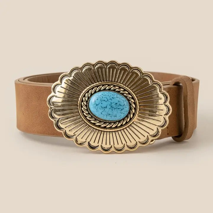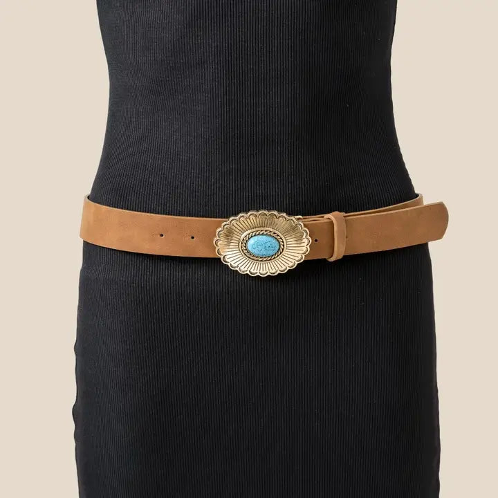 Make a statement, this belt includes a stunning large western turquoise buckle design. Discover a new level of fashion versatility as this belt effortlessly elevates the allure of your attire.