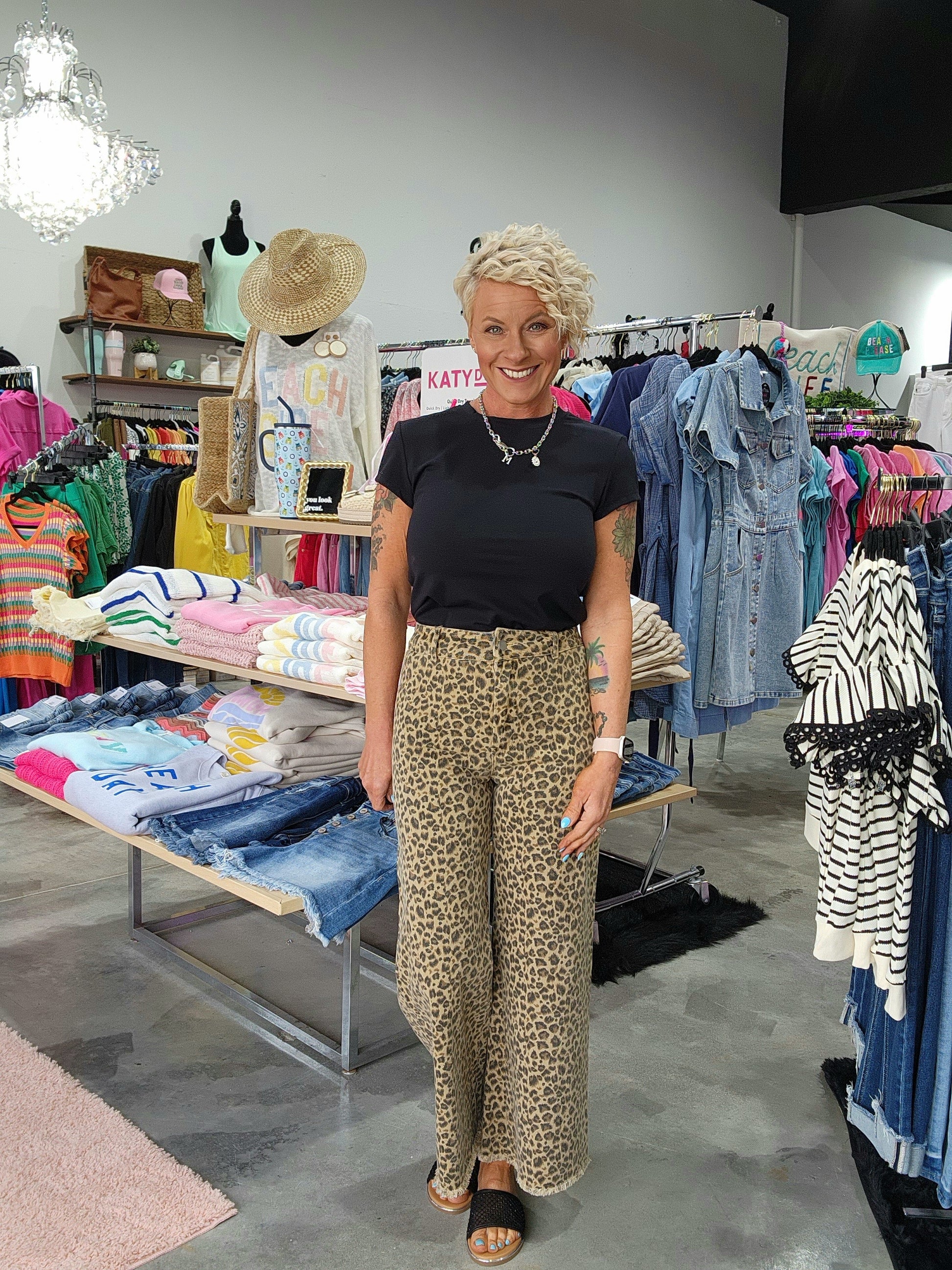 Get wild with our Leopard High Rise Denim Frayed Wide Leg Pants! These statement pants feature a playful leopard print, a comfortable high rise fit, and a trendy frayed hem. Made from twill denim, they offer both style and comfort.