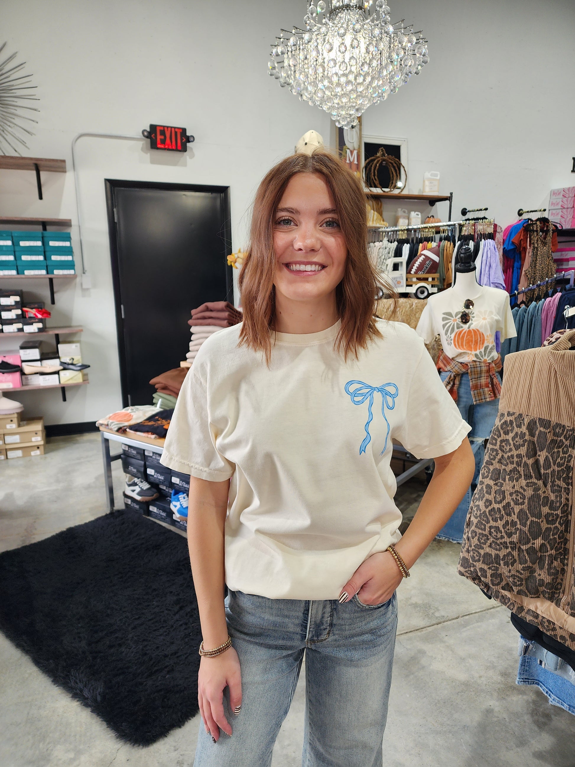 This cream-colored graphic tee, made from soft Comfort Colors fabric, offers both comfort and meaningful style. Featuring a delicate blue bow on the front and a beautiful design on the back, it’s a perfect way to share your faith with warmth and confidence throughout the day.