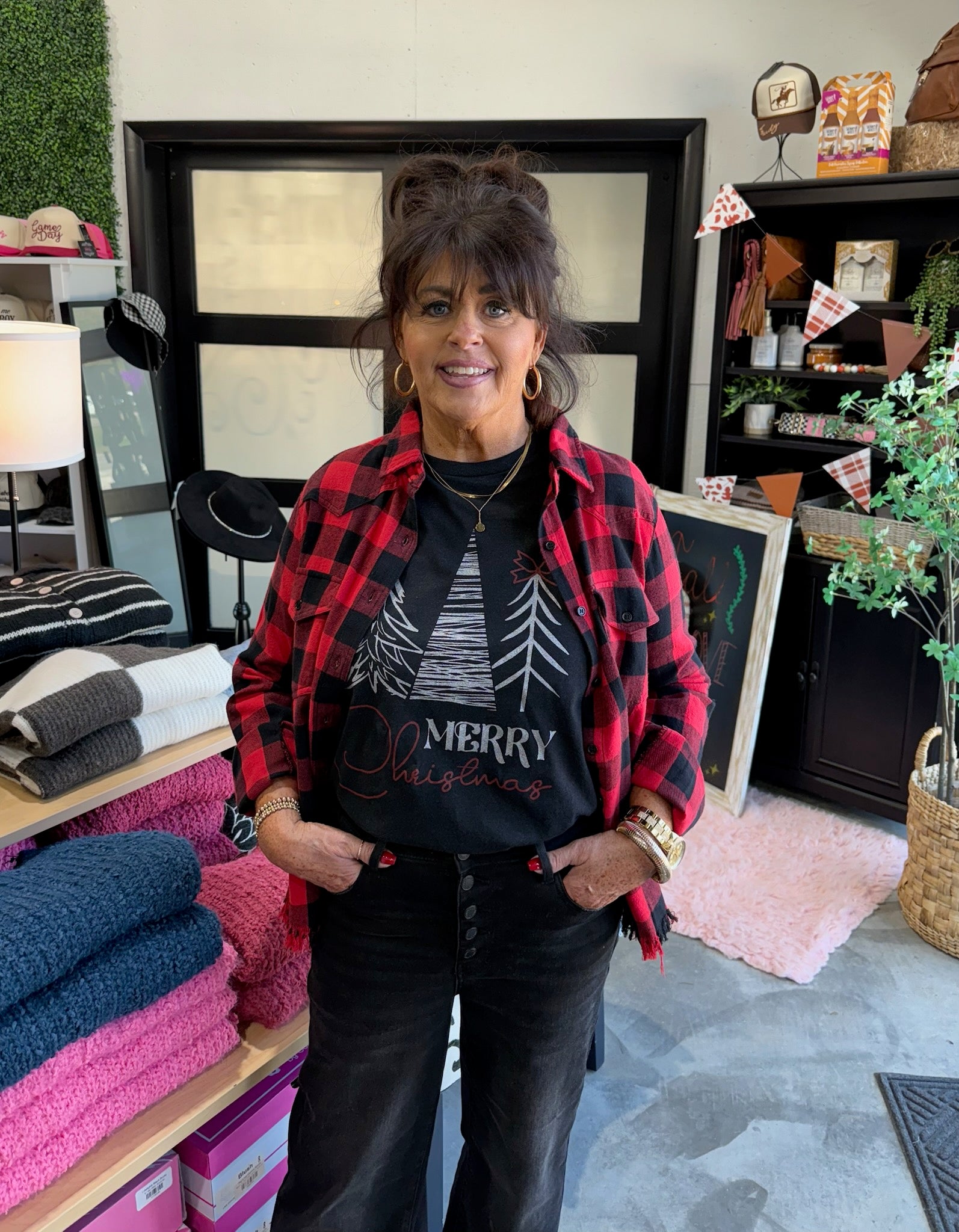 Celebrate the holidays in style with our Merry Christmas Holiday Tee! This heather black graphic tee features festive lettering and three unique Christmas tree designs, each printed in silver metallic ink. Add some sparkle and cheer to your wardrobe this season!