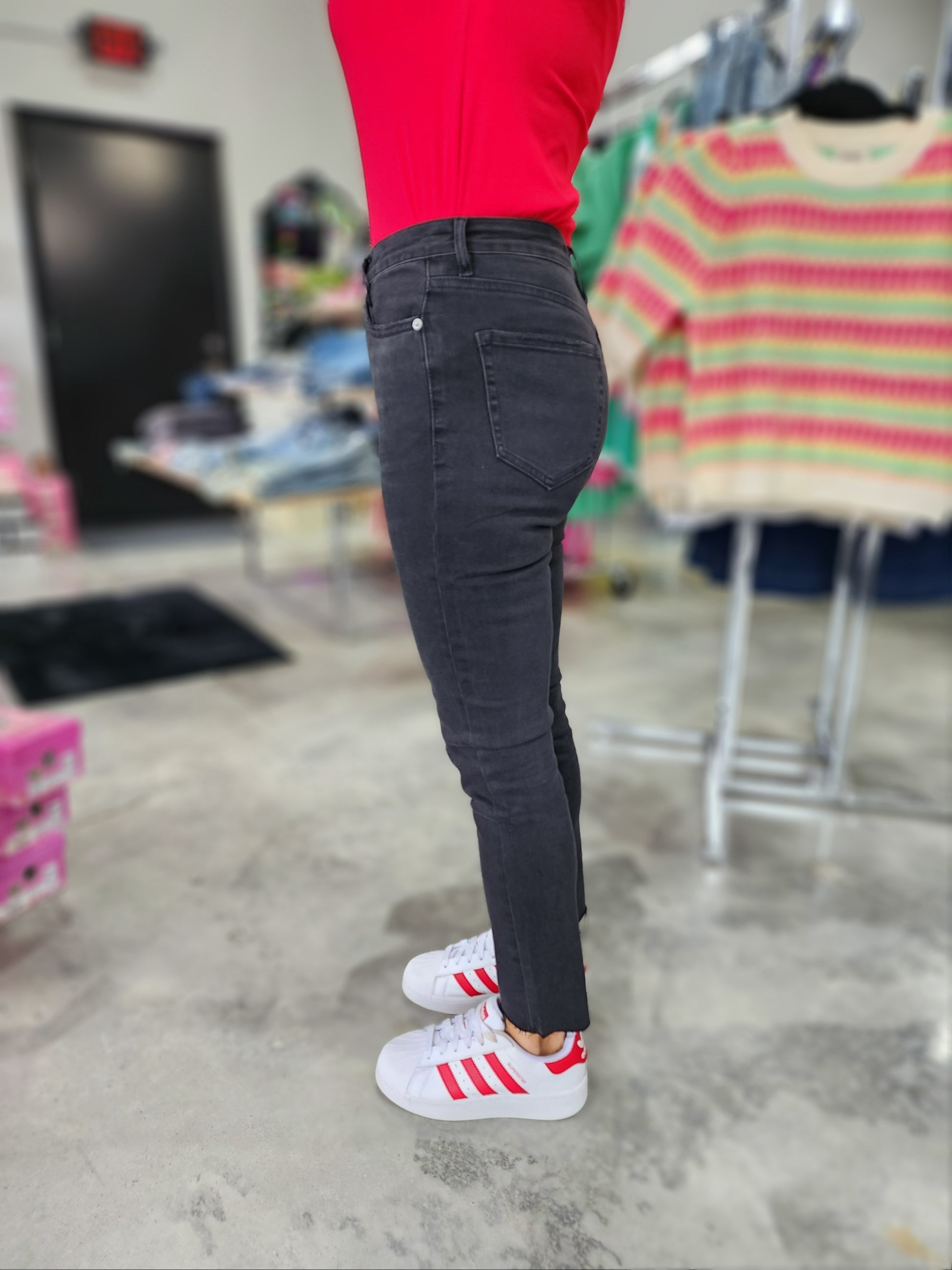These Mica High Rise Cropped Skinny Denim Jeans offer a flattering fit with their high-rise waist and skinny silhouette. Crafted from black denim, they feature a raw hem for a modern, edgy look. Perfect for everyday wear, they provide comfort and style that supports your confidence throughout the day.