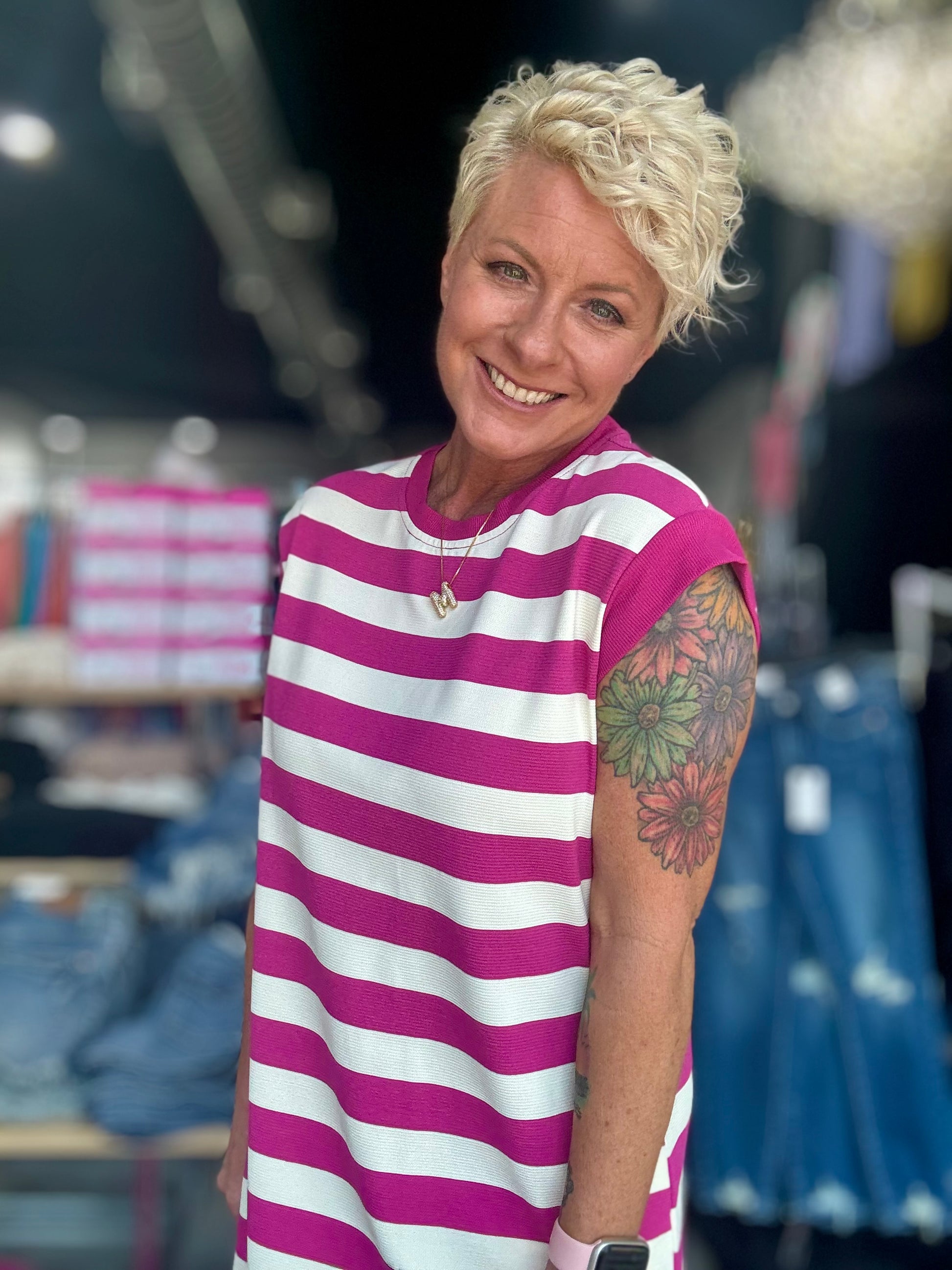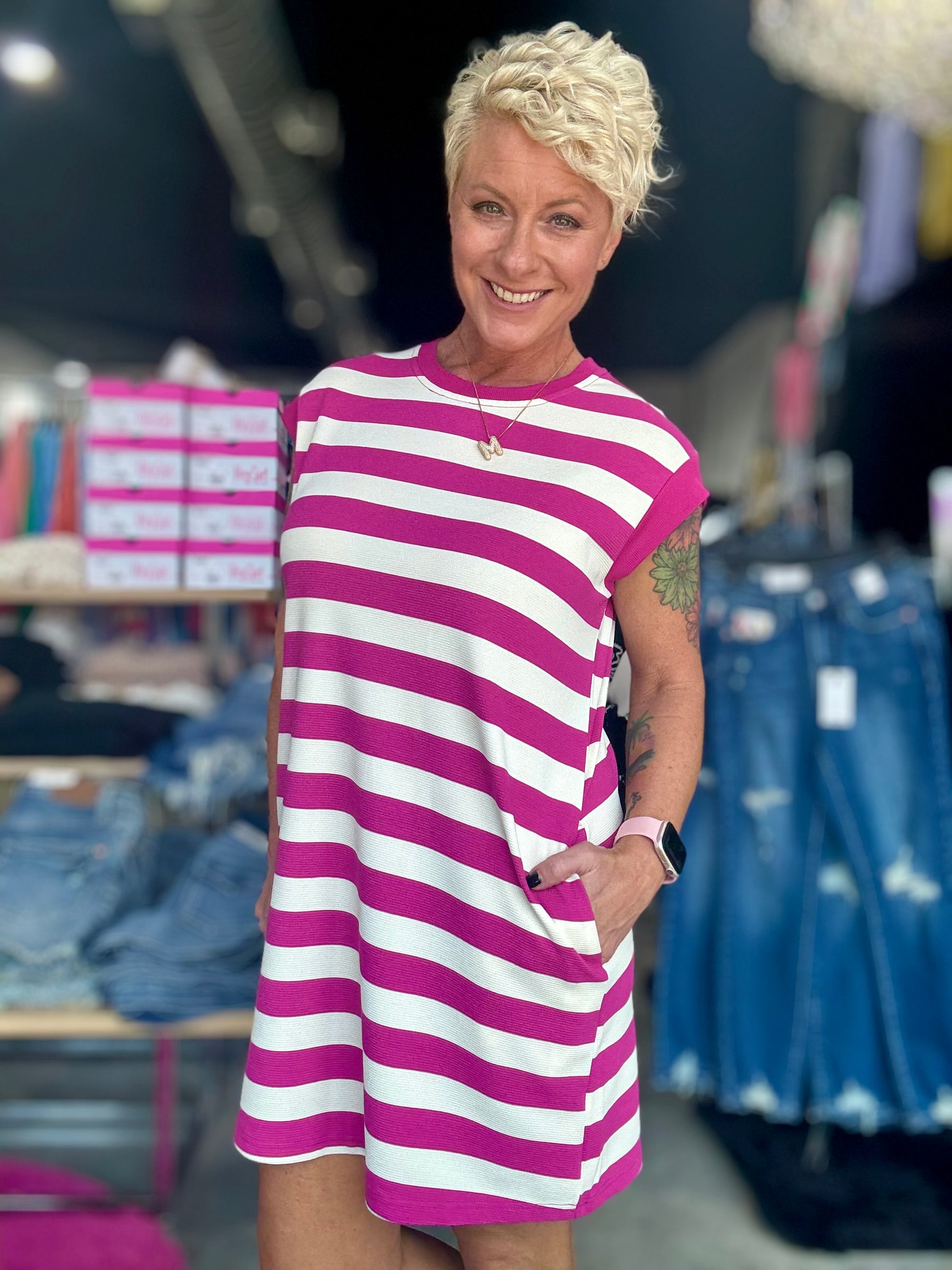 This lightweight and comfy Pink & Perfect Dress will have you feeling effortlessly stylish thanks to its pink and white striped design. And with side pockets, you'll have a convenient place to keep your essentials. Perfect for any occasion!