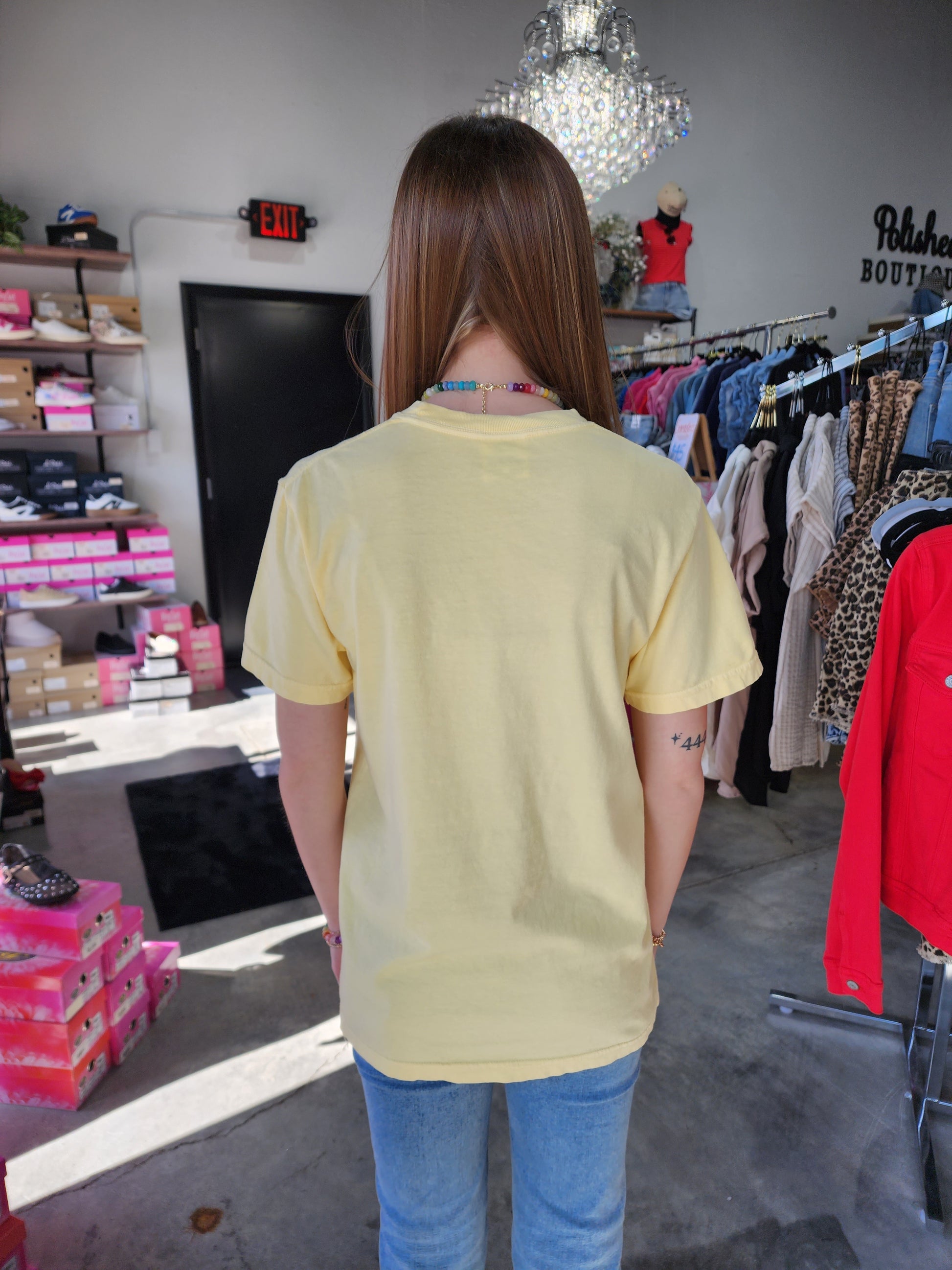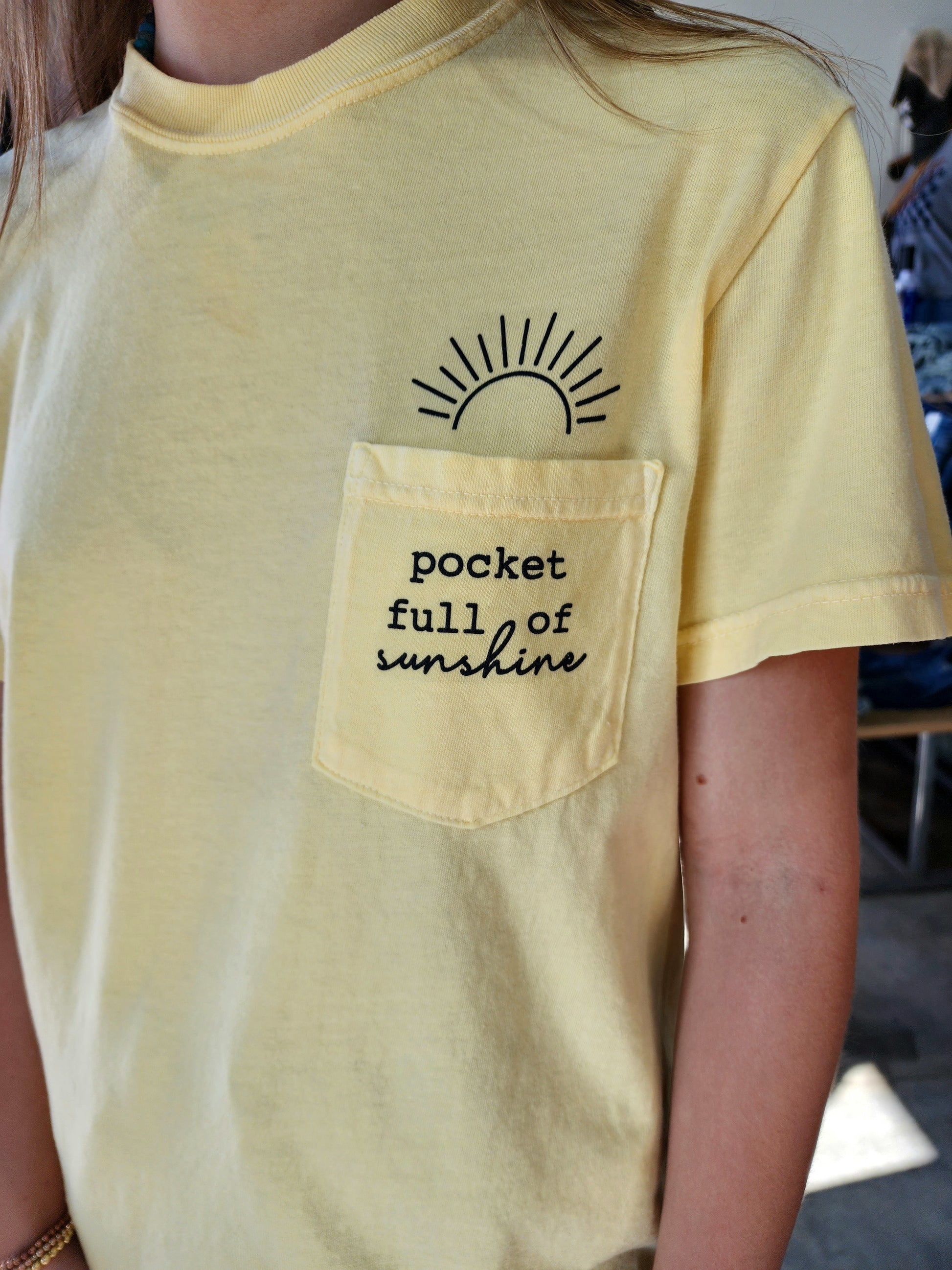 This playful yellow tee brings the sunshine wherever you go! Featuring "pocket full of sunshine" in bold black lettering on the front pocket, this Comfort Colors t-shirt lives up to its name with ultra-soft fabric that feels amazing all day long.