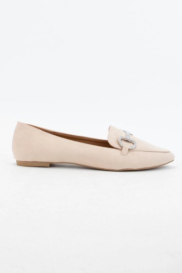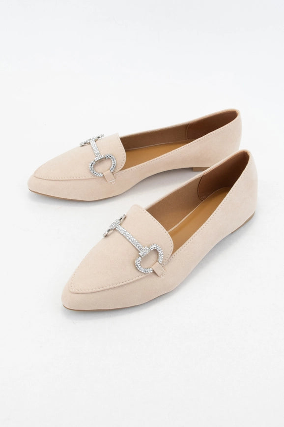 These Faux Suede Leather Pointed Toe Rhinestone Shimmer Flats are the perfect footwear for a night out. Subtle yet glamorous, the shoes come in a nude color with a sparkly silver rhinestone buckle detail. Its flattering pointed toe shape makes it a must-have for any wardrobe.