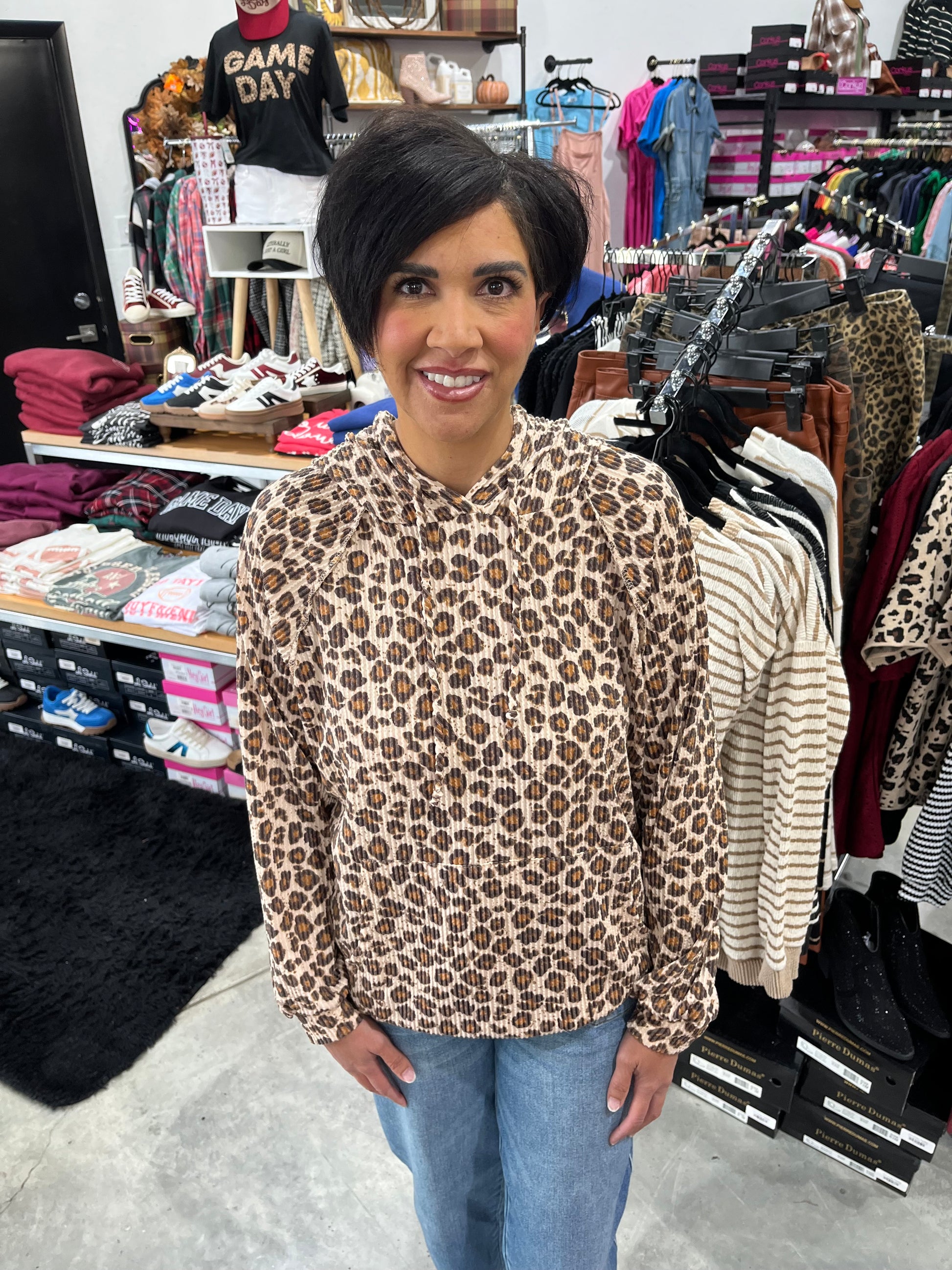 Get ready to turn heads with the Ribbed Leopard Hoodie Top! Featuring long puff sleeves and a playful drawstring hood, this urban-inspired ribbed hoodie adds wild charm to your everyday look. The kangaroo pocket keeps your hands cozy, while stitch details give it extra character. Perfect for those who love a bold, comfy style with a touch of fierce fun!