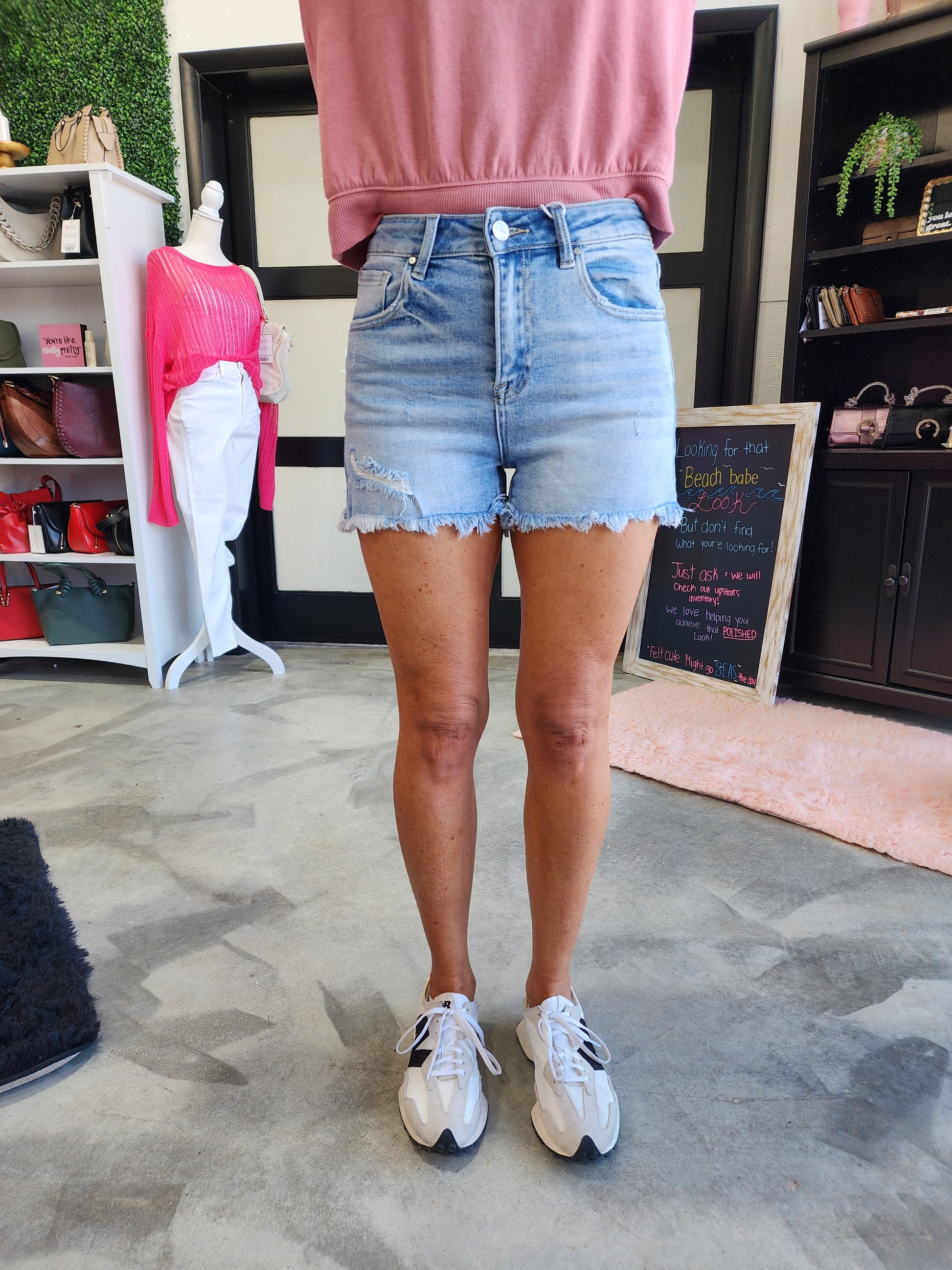 Introducing Risen High Rise Shorts, expertly designed and crafted to provide a chic and stylish look. The high rise cut enhances and flatters your figure, while the light color denim and minimal distressing add a modern touch. With a frayed hem, these shorts are perfect for any occasion.