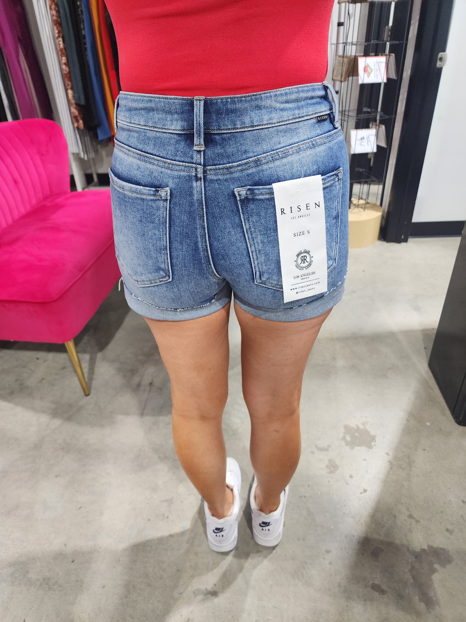 Effortless summer style meets comfort in these mid-rise denim shorts. The medium wash pairs perfectly with the playful red and navy stripes running along the cuffed hem—a fun detail that elevates any casual look. Perfect for everything from weekend hangouts to laid-back adventures.