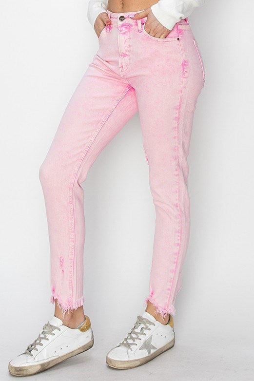 Our Risen Pink Acid Wash High Waist Skinny Jeans feature a flattering high waist and a sleek, skinny fit. The frayed hem adds a touch of effortless cool. Perfect for those who like to stand out, these jeans are not only stylish but also incredibly cute. Get your hands on these playful and unique pink acid wash jeans today!