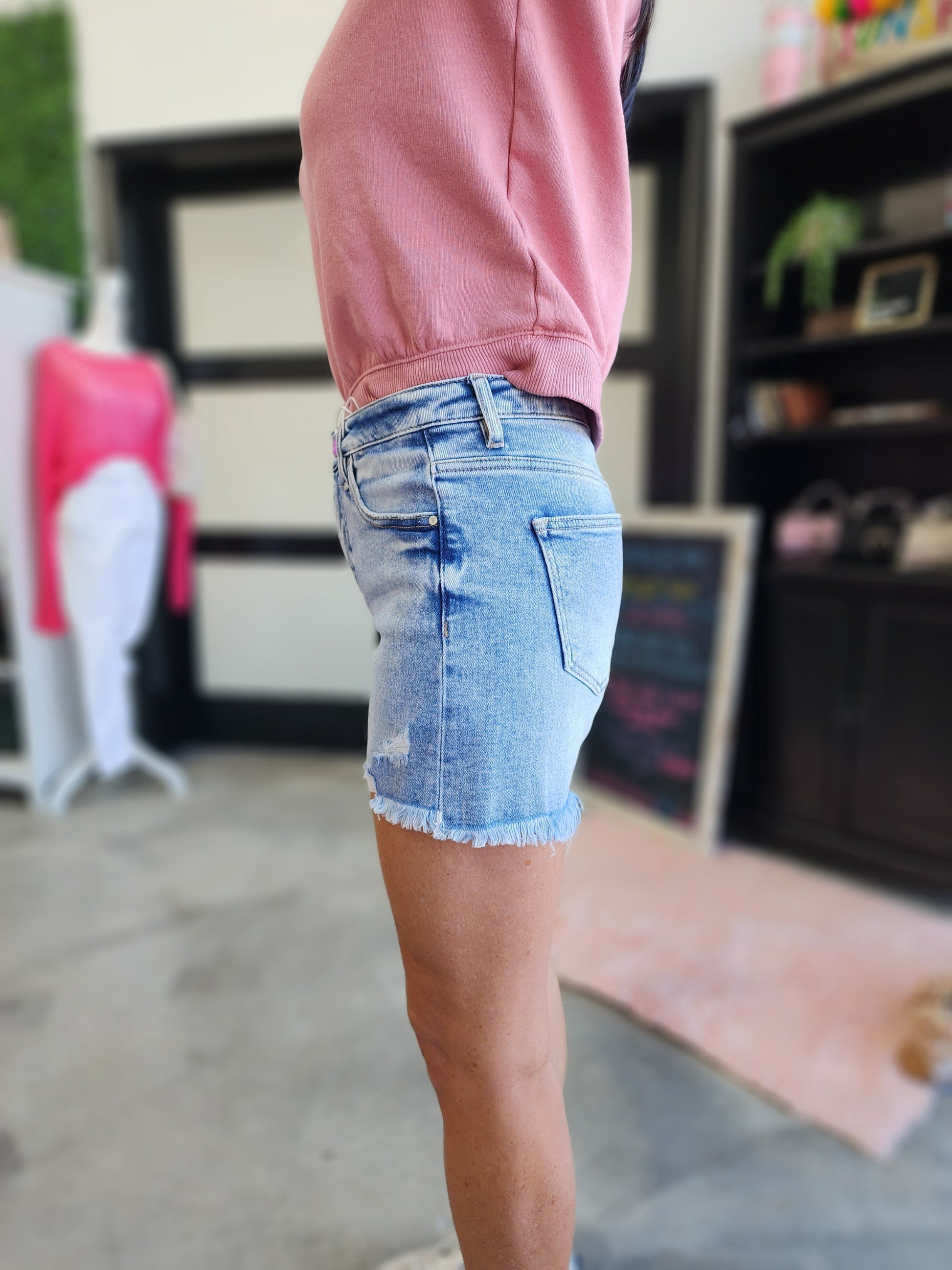 The Risen Tummy Control High Rise Loose Fit Shorts offer a high waist for a comfortable, flattering fit. Featuring a medium denim color and minimal distressing, these shorts also have tummy control and a loose fit for added comfort. The frayed hem adds a trendy touch.