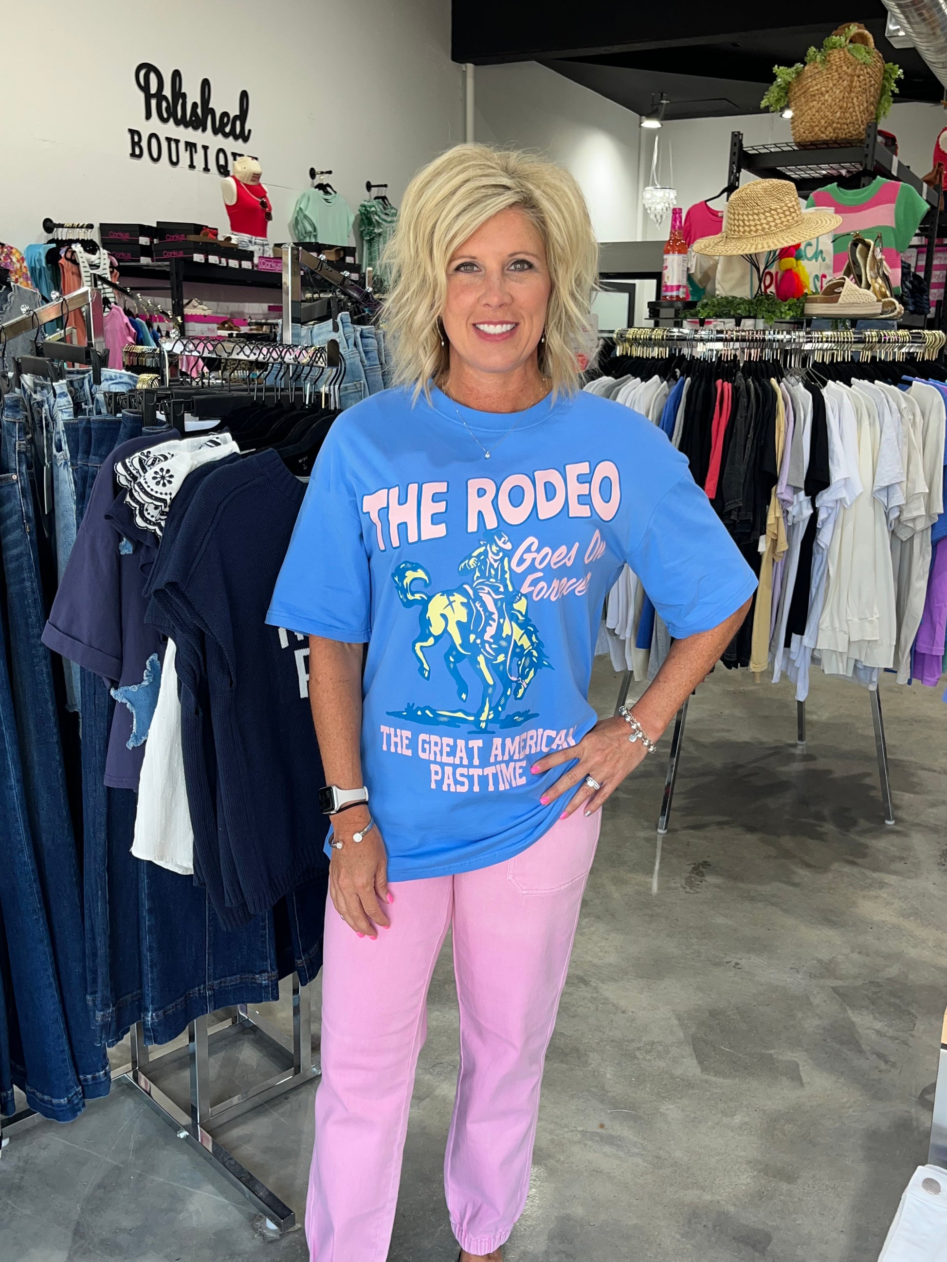 Show your rodeo spirit with the Rodeo Forever Graphic T-Shirt, perfect for country concerts or rodeo days. This oversized tee brings a fun, relaxed vibe—just be sure to size down for the best fit. Wear it and let your love for country shine with a playful touch!