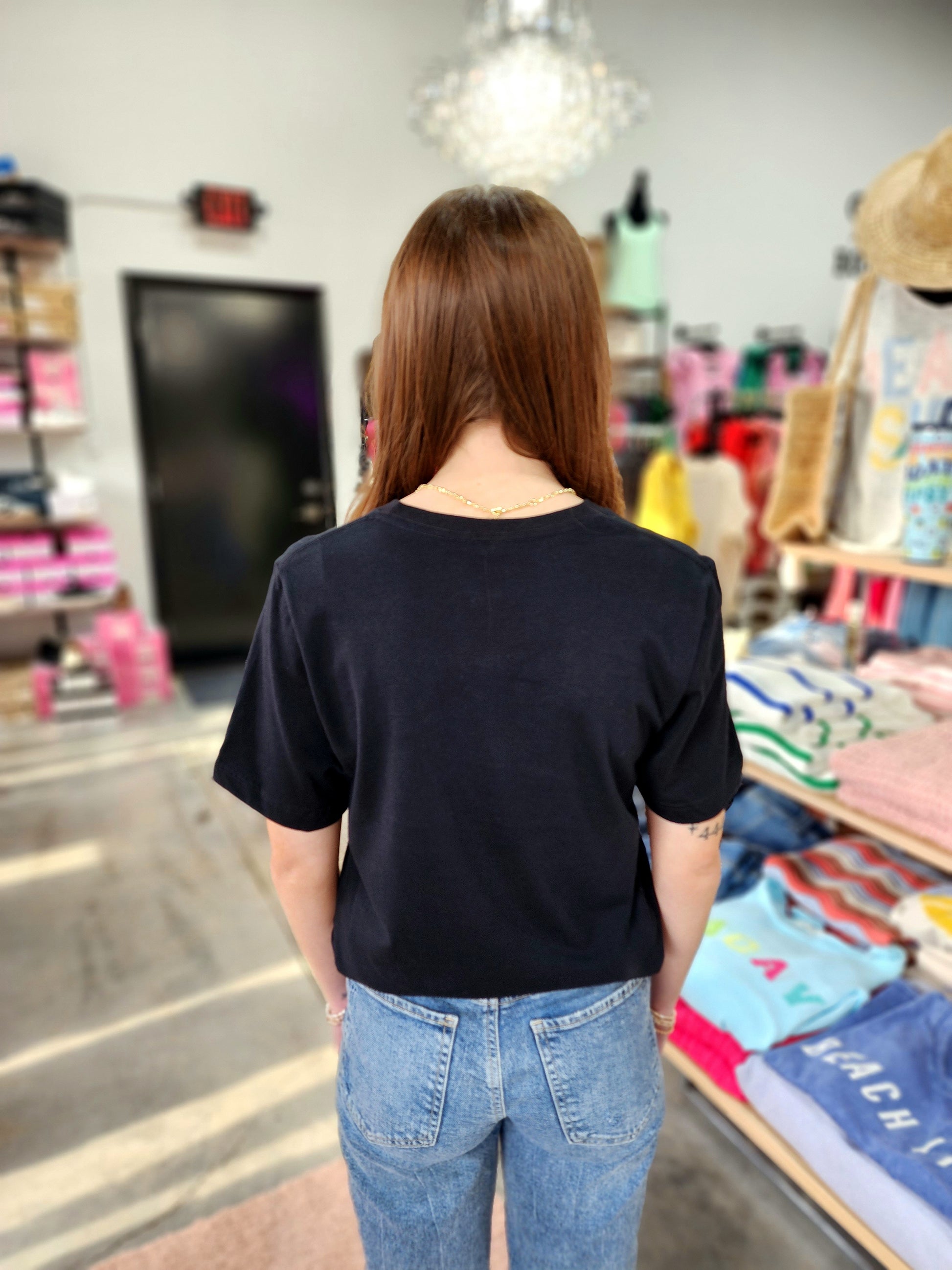 Unleash your inner rebel with "She's A Good Girl" graphic tee. Made with lightweight fabric, this black t-shirt features white lettering, stars, and an eagle for a touch of edginess. Perfect for any casual occasion, pair it with a blazer, denim jeans, or shorts and show off your playful side.