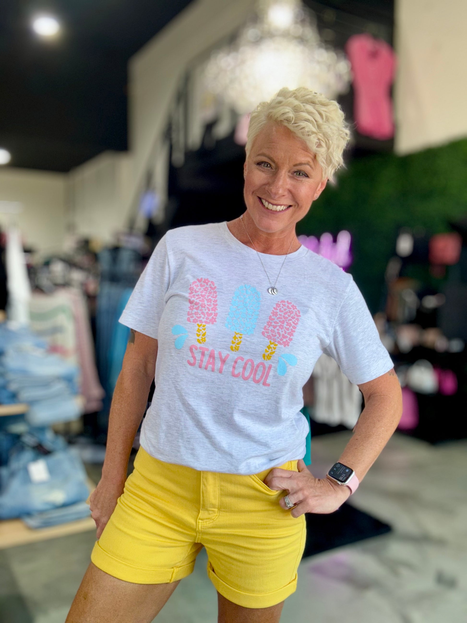This graphic tee is the epitome of summer vibes with its colorful popsicles and floral design. The playful popsicles on the shirt add a fun and refreshing touch to any outfit. "Stay Cool" this summer with this fun and colorful graphic tee!