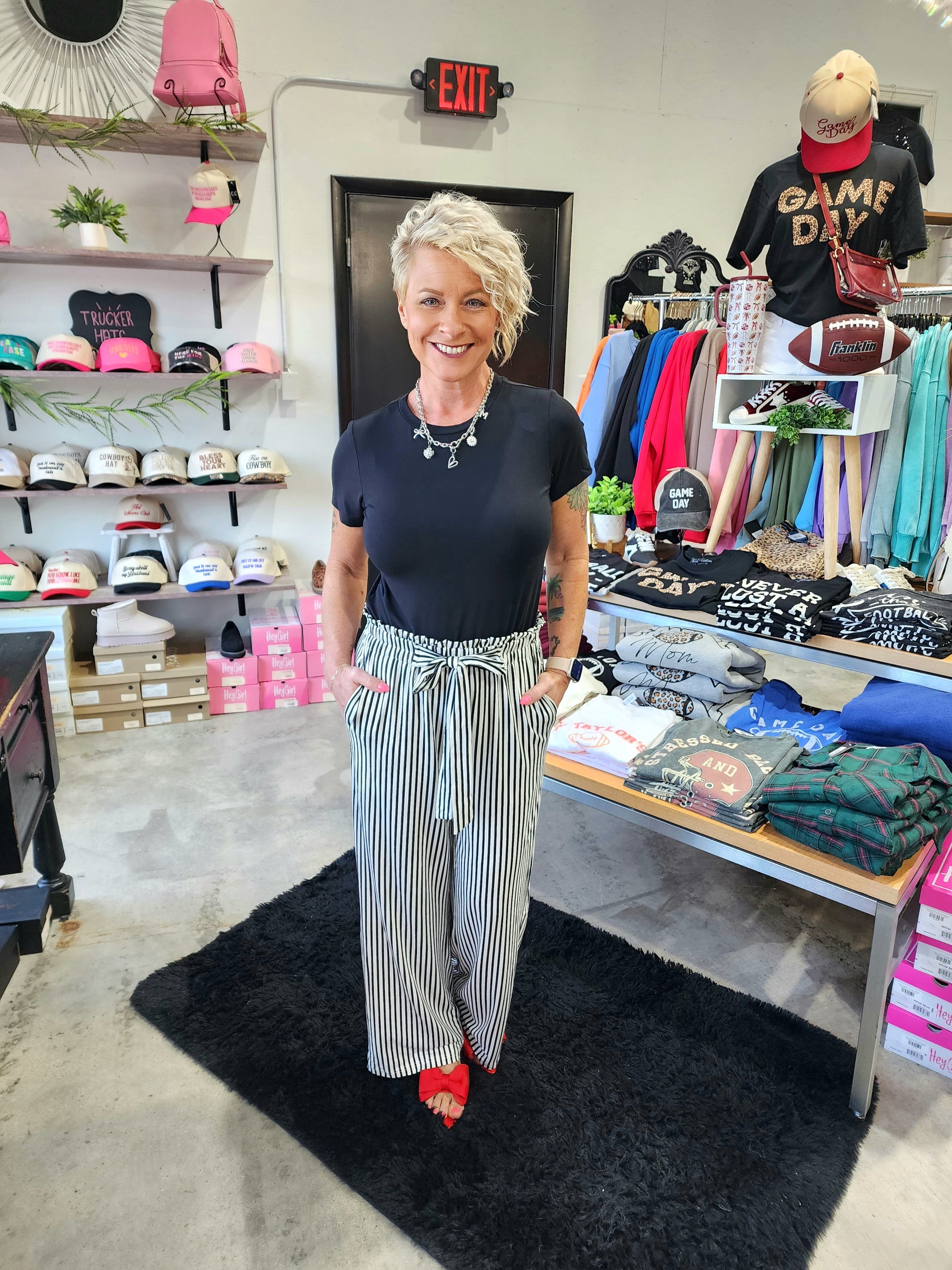 These black and white striped wide-leg pants offer both comfort and style. The adjustable drawstring knot ensures a secure, personalized fit, while the wide-leg design provides ease of movement. Perfect for any occasion, they can easily be dressed up or down to suit your needs. Enjoy a versatile wardrobe staple that supports your confidence and comfort throughout the day.
