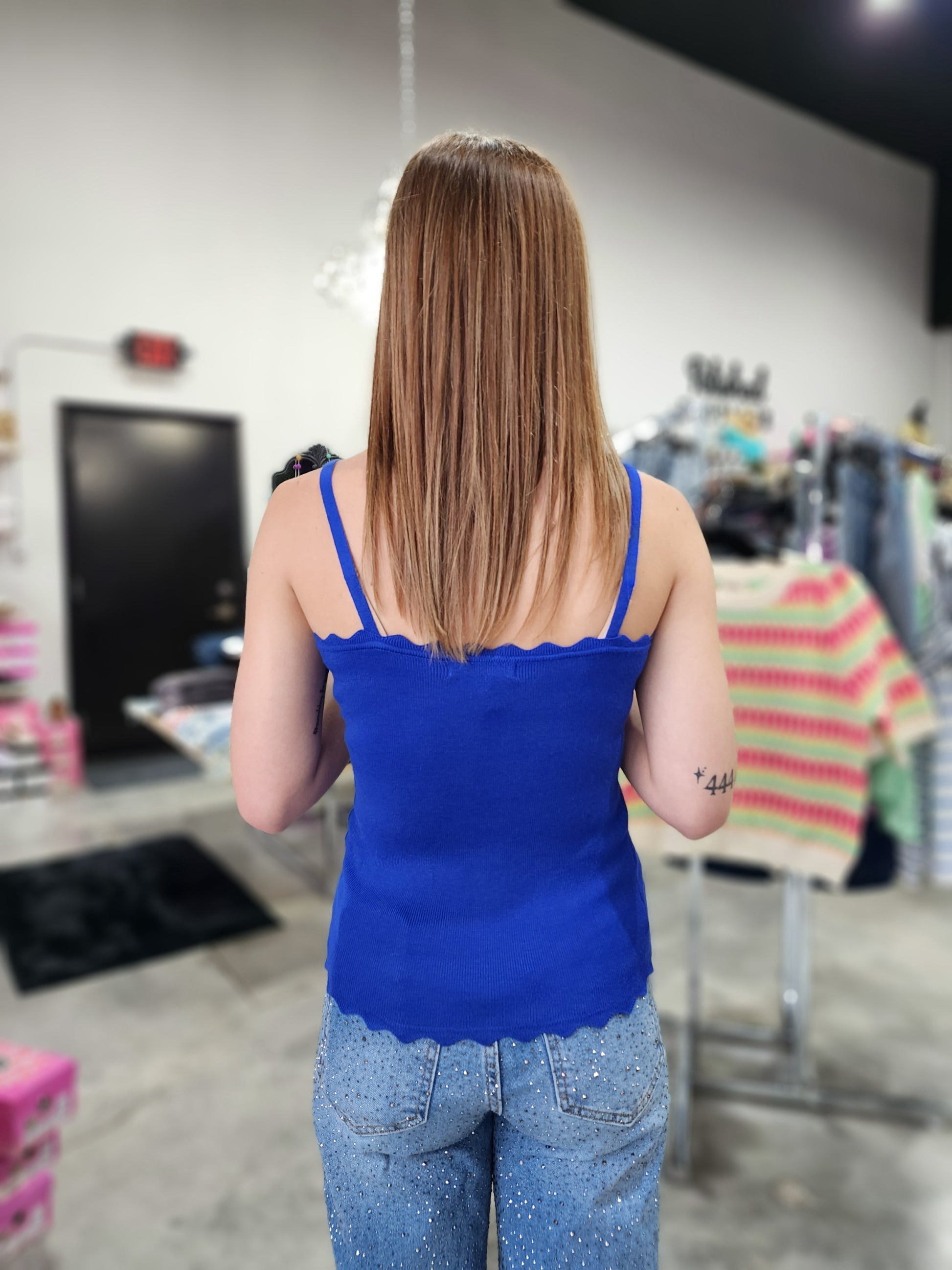 The Blue Crush Cami Top features a flirty scoop neckline and delicate spaghetti straps that keep things light and breezy. Its charming scalloped detail adds a playful touch, making it perfect for sunny days and casual outings. Embrace effortless style with this fun and feminine cami!
