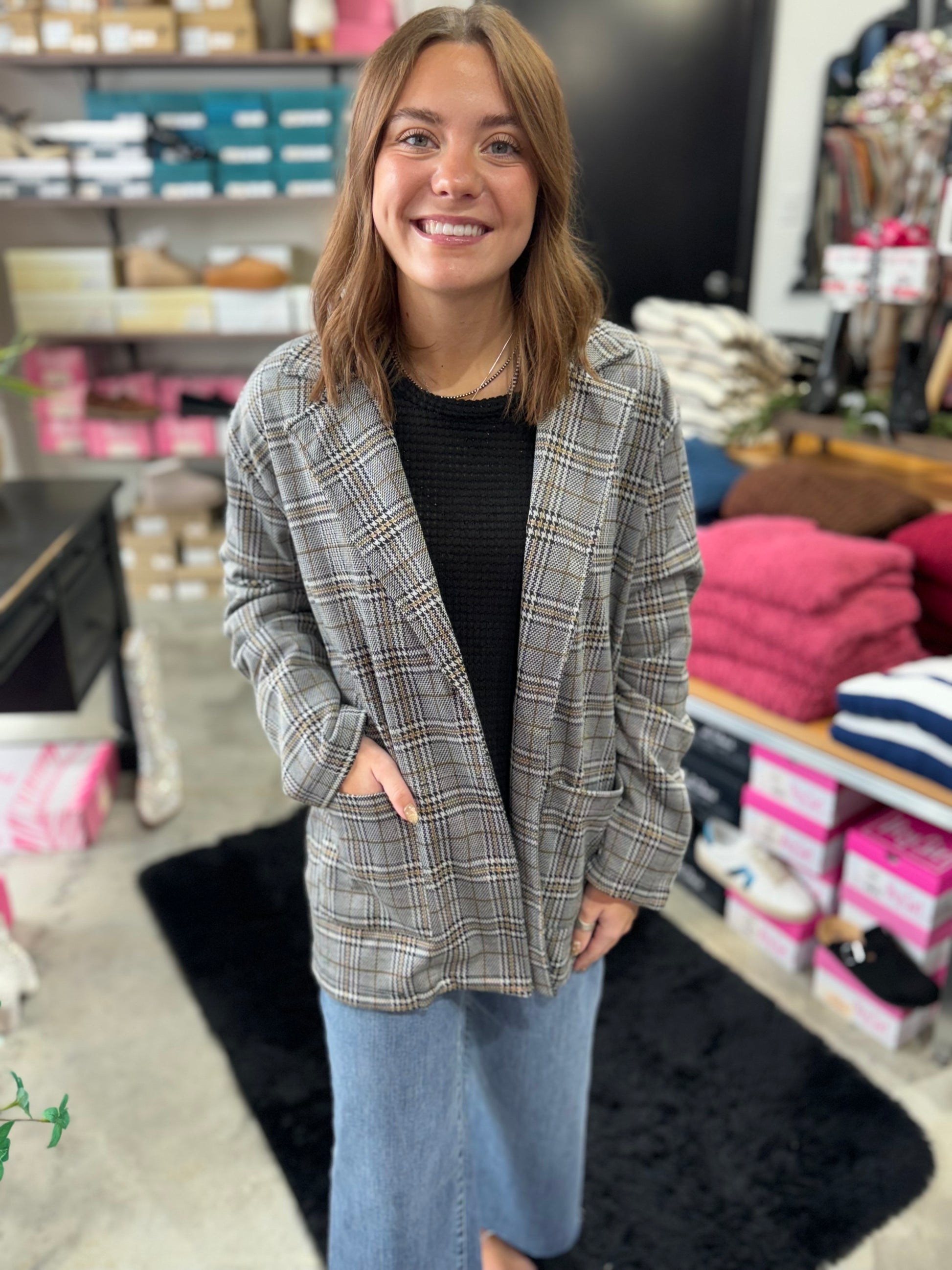Elevate your style with The Bradley Blazer featuring practical pockets. The classic plaid pattern exudes timeless sophistication, while the tailored fit ensures a sleek silhouette. This versatile blazer adds a polished touch to any outfit.