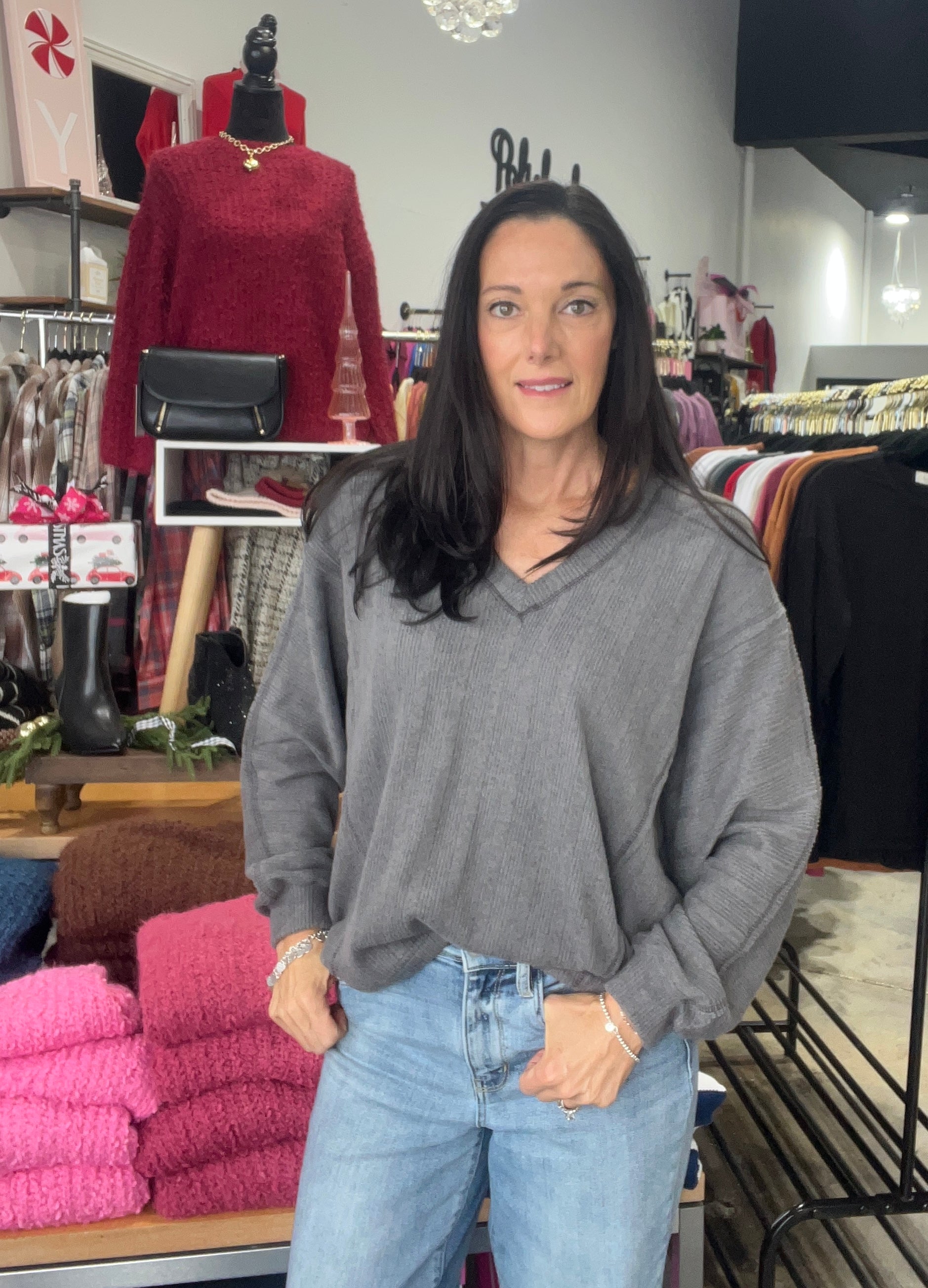 The Cali Top is an easy-to-wear essential with a flattering v-neck and ribbed texture. Long sleeves keep you comfortable and covered, while the relaxed silhouette allows for natural movement and all-day wearability. A versatile staple that pairs with everything in your wardrobe.