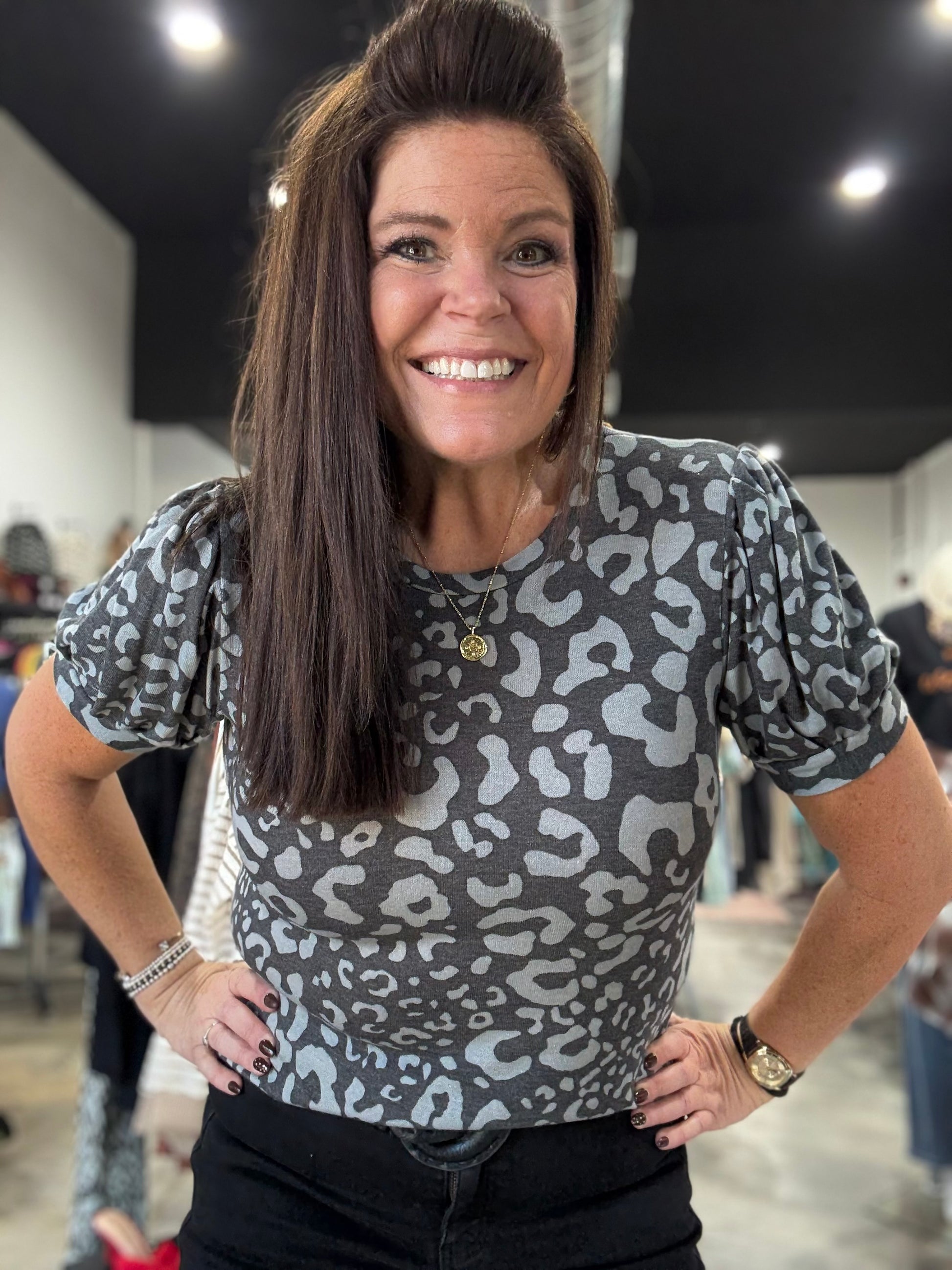 The Charcoal Leopard Top brings playful flair to your wardrobe with its lightweight fabric and breezy short sleeves. Featuring charming puff sleeves and a sleek charcoal leopard print, it’s perfect for adding a fun, fierce touch to any outfit without feeling heavy. Stay stylish and comfortable all day long!