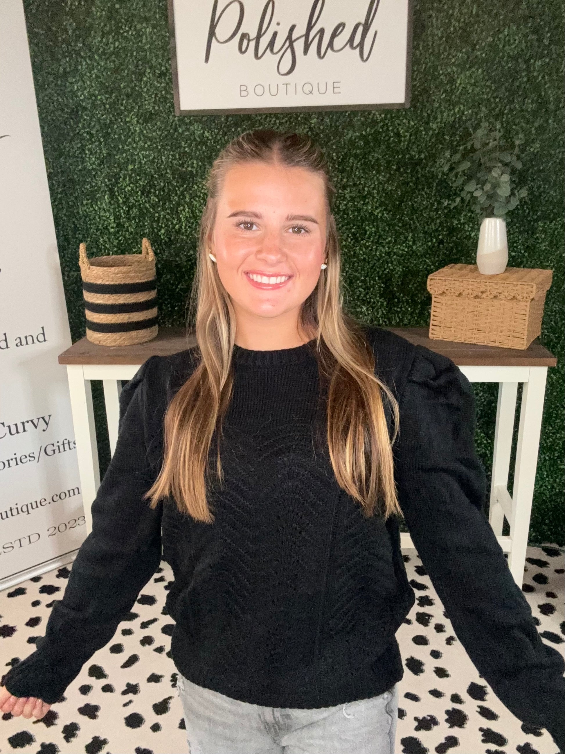 The Gia Sweater boasts long balloon sleeves and a ribbed crew neck, topped off with intricate pointelle stitching. Stay cozy and stylish with this versatile addition to your wardrobe.