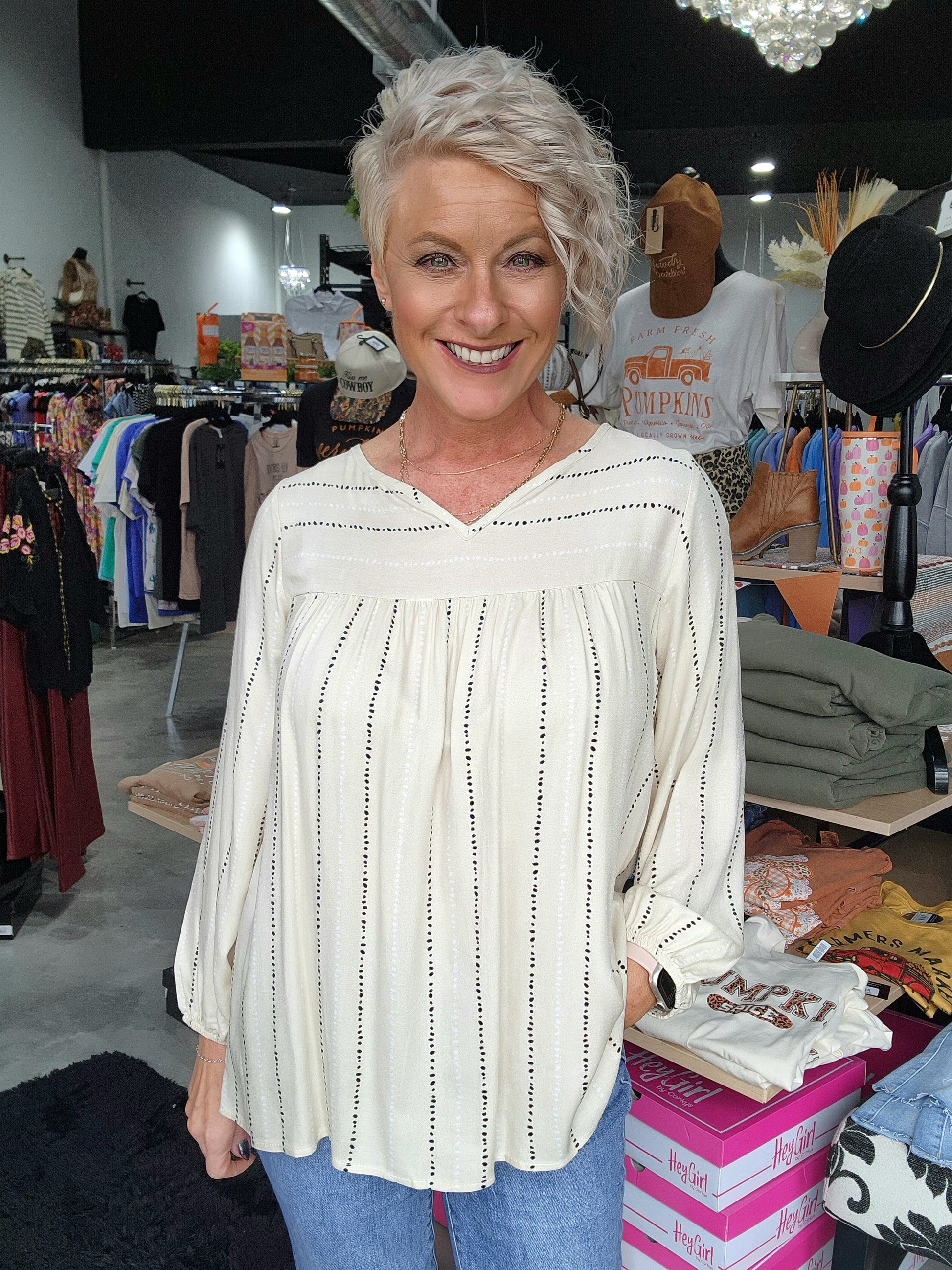 The Haven Long Sleeve Top features a delicate cream fabric adorned with a subtle black and white dotted pattern. Its v-neckline and elasticized wrists create an elegant yet comfortable silhouette, making it an ideal choice for both professional settings and versatile occasions. This blouse effortlessly blends refined style with everyday wearability.