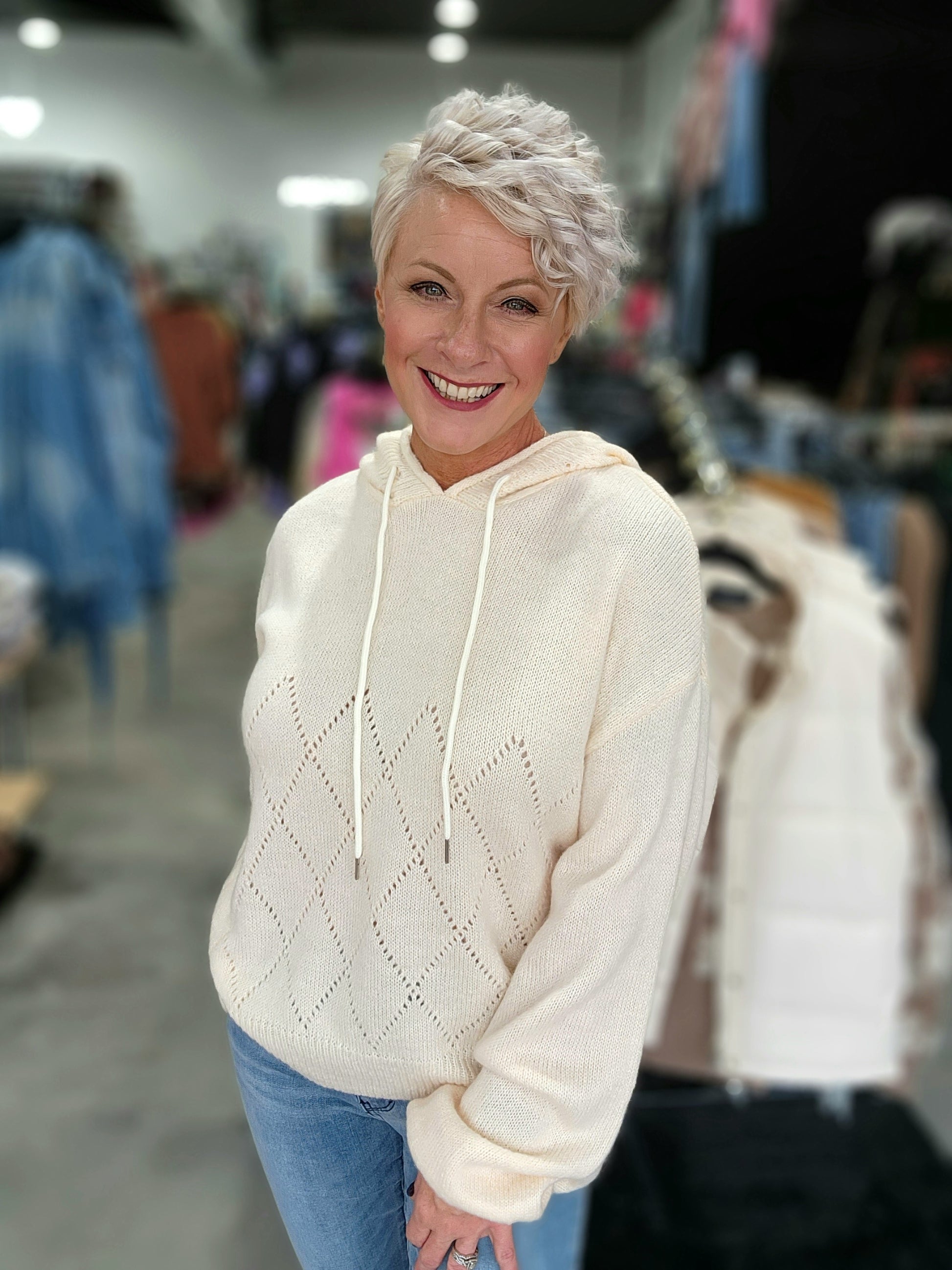 This Ivory Sweater features a drawstring hood, ruffled cuffs, and intricate pointelle patterning, offering both style and warmth. Have fun and stay adorable in this playful, yet practical, sweater.