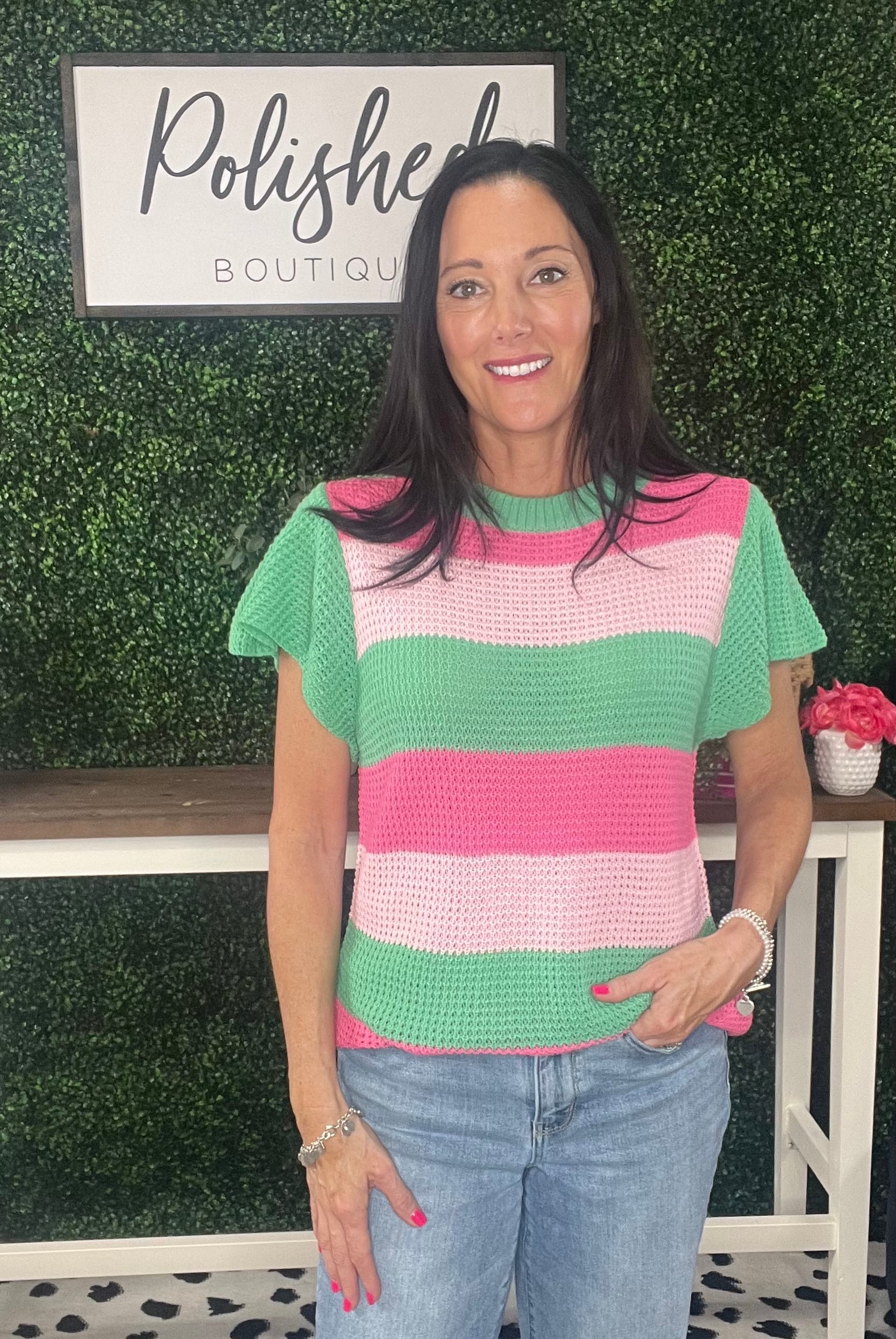 The Jaycee Sweater features bold, thick stripes in a lightweight, short-sleeve design perfect for transitional weather. This versatile piece combines trendy pattern work with a comfortable fit, making it an essential addition to your spring and summer wardrobe. The contemporary silhouette pairs effortlessly with denim or shorts for a polished yet casual look.
