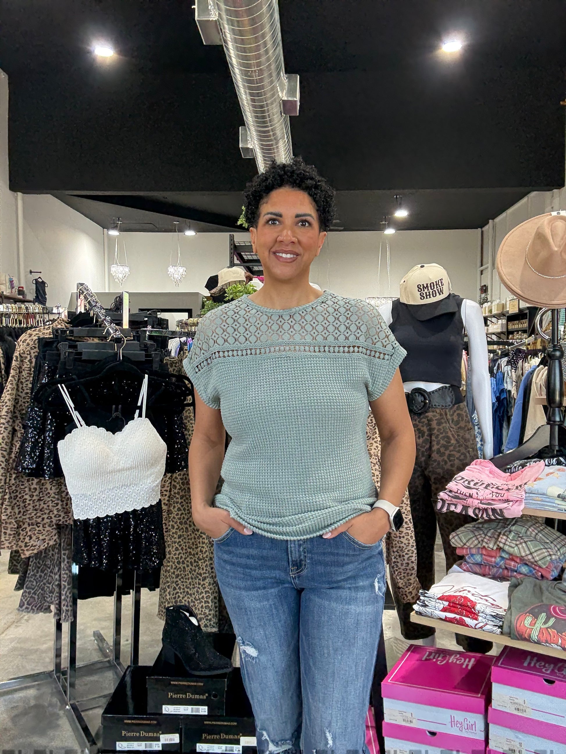 The intricate design of The Lace Patchwork Top adds a touch of elegance and the waffle texture enhances visual appeal and comfort, making it perfect for both work and special occasions. Embrace your style with this versatile and charming top.