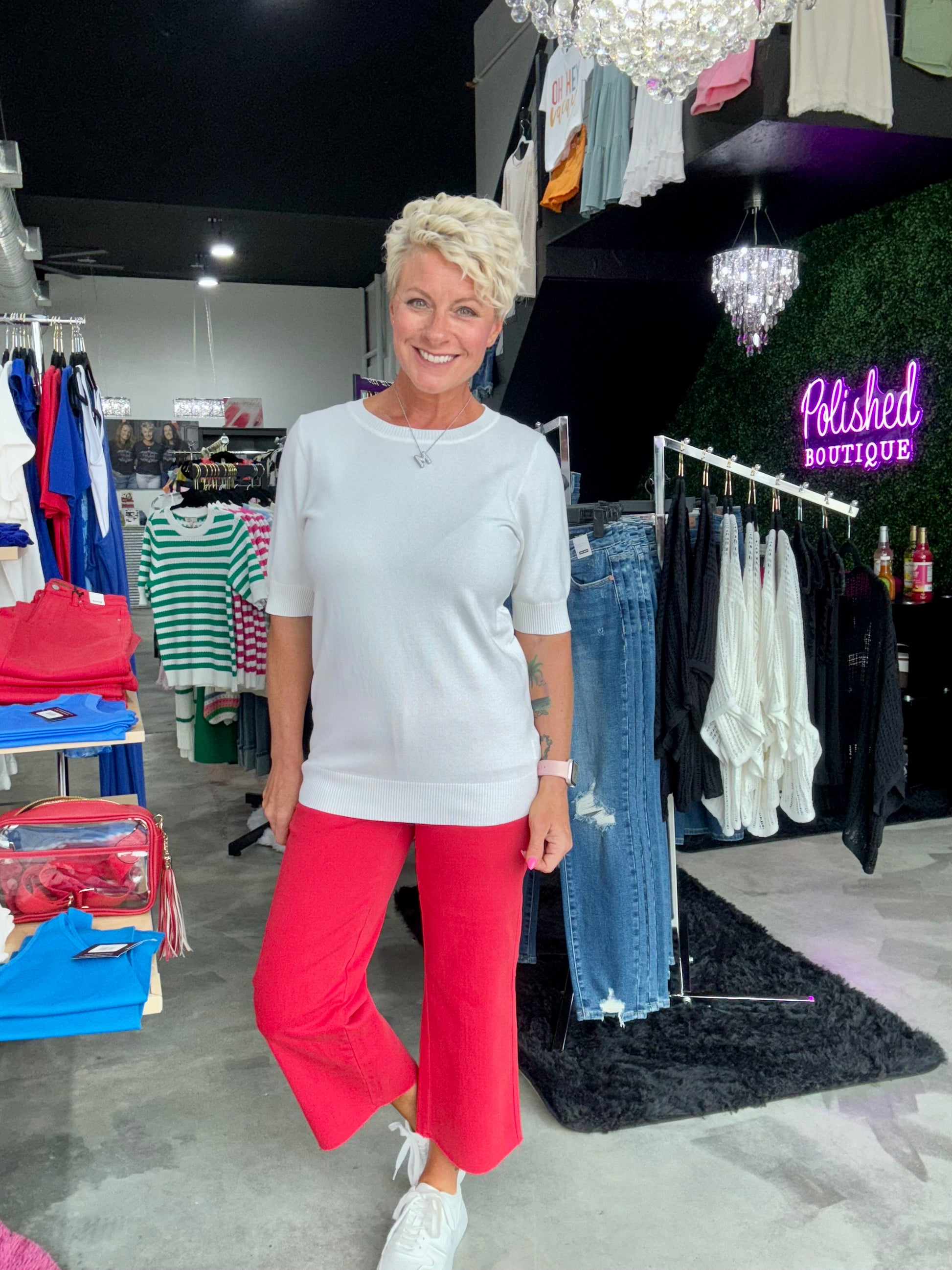 Introducing the Madison Avenue Short Sleeve Sweater, a luxurious staple for your wardrobe. Crafted with a classic crewneck and short sleeves, this lightweight sweater exudes elegance. Available in four sophisticated colors: royal blue, red, cream, and black.
