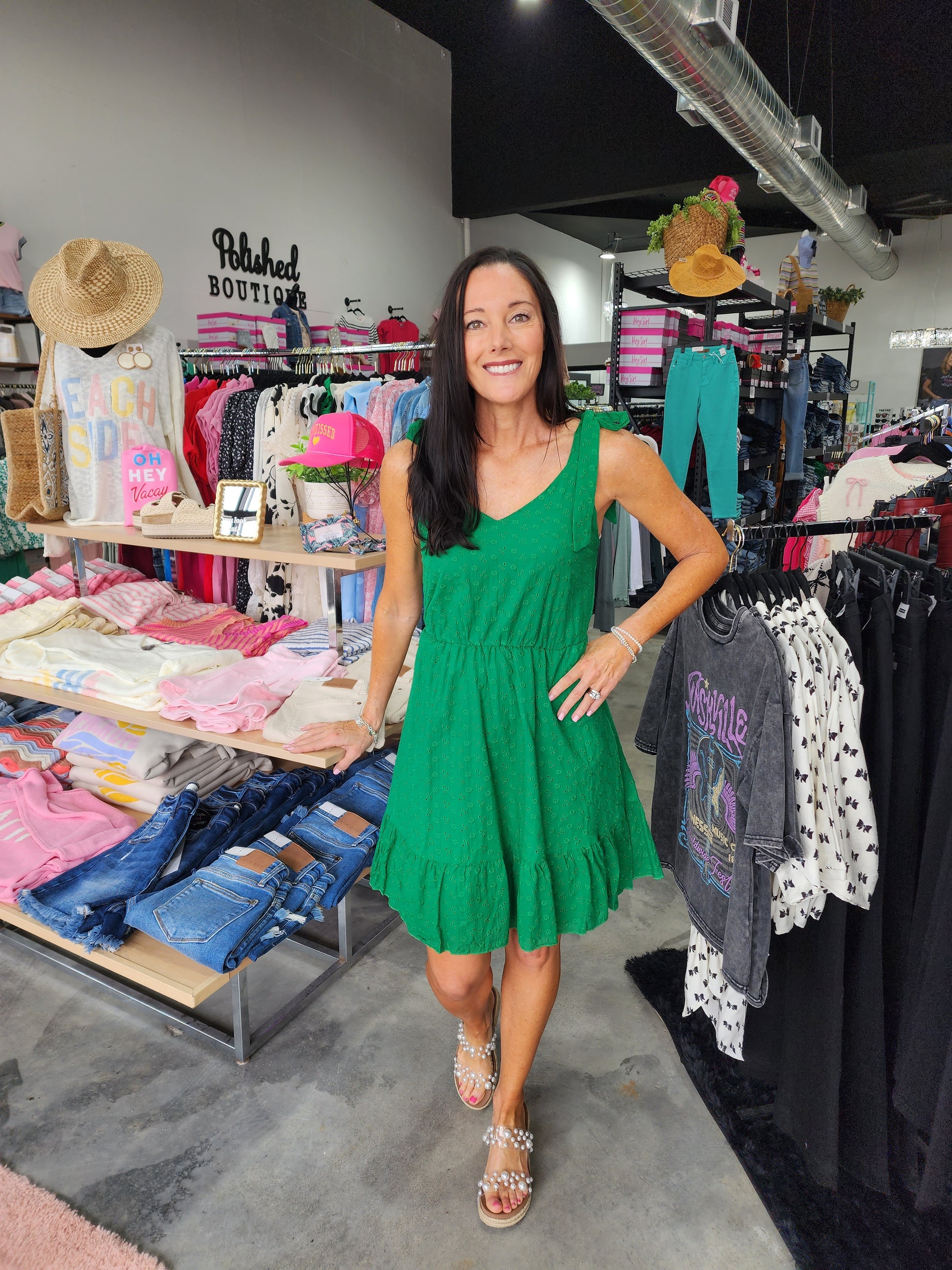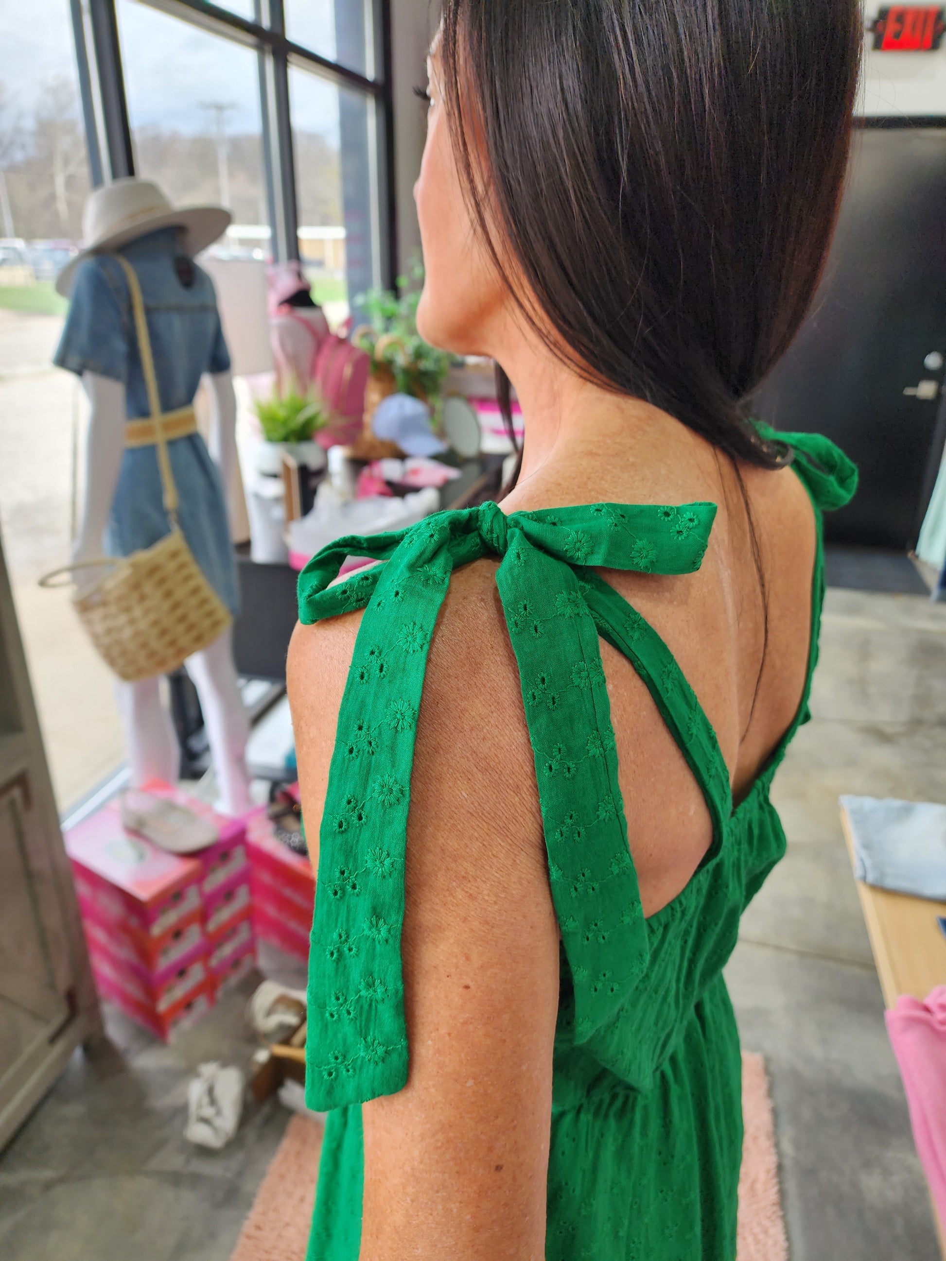 The Meadow Mornings Dress features a charming tie shoulder design and a playful ruffle hem, perfect for a breezy summer look. Its mini length and sleeveless design make it ideal for warm weather, while the eyelet detailing in a vibrant kelly green adds a touch of whimsy. Embrace the beauty of nature in this dress.
