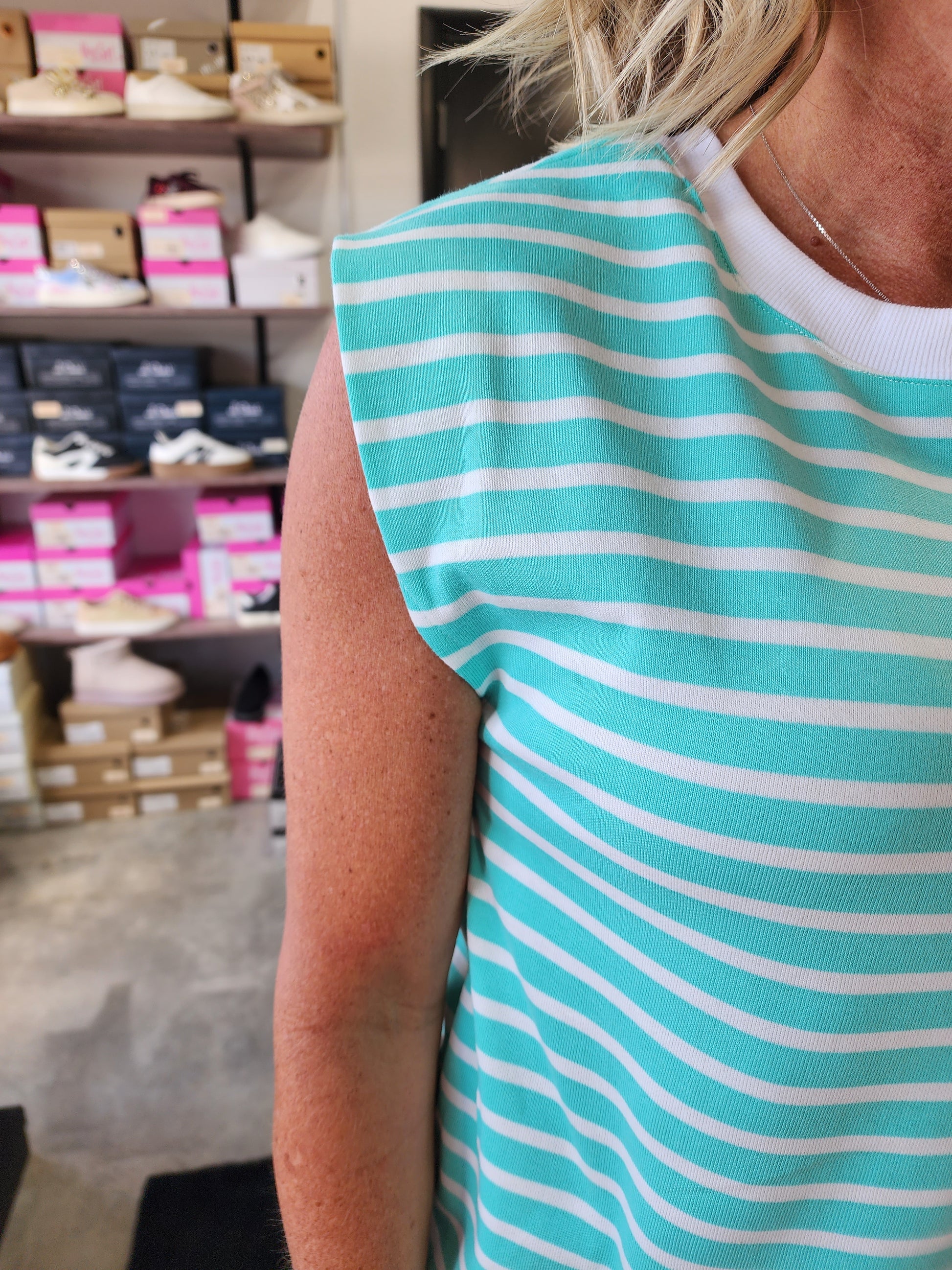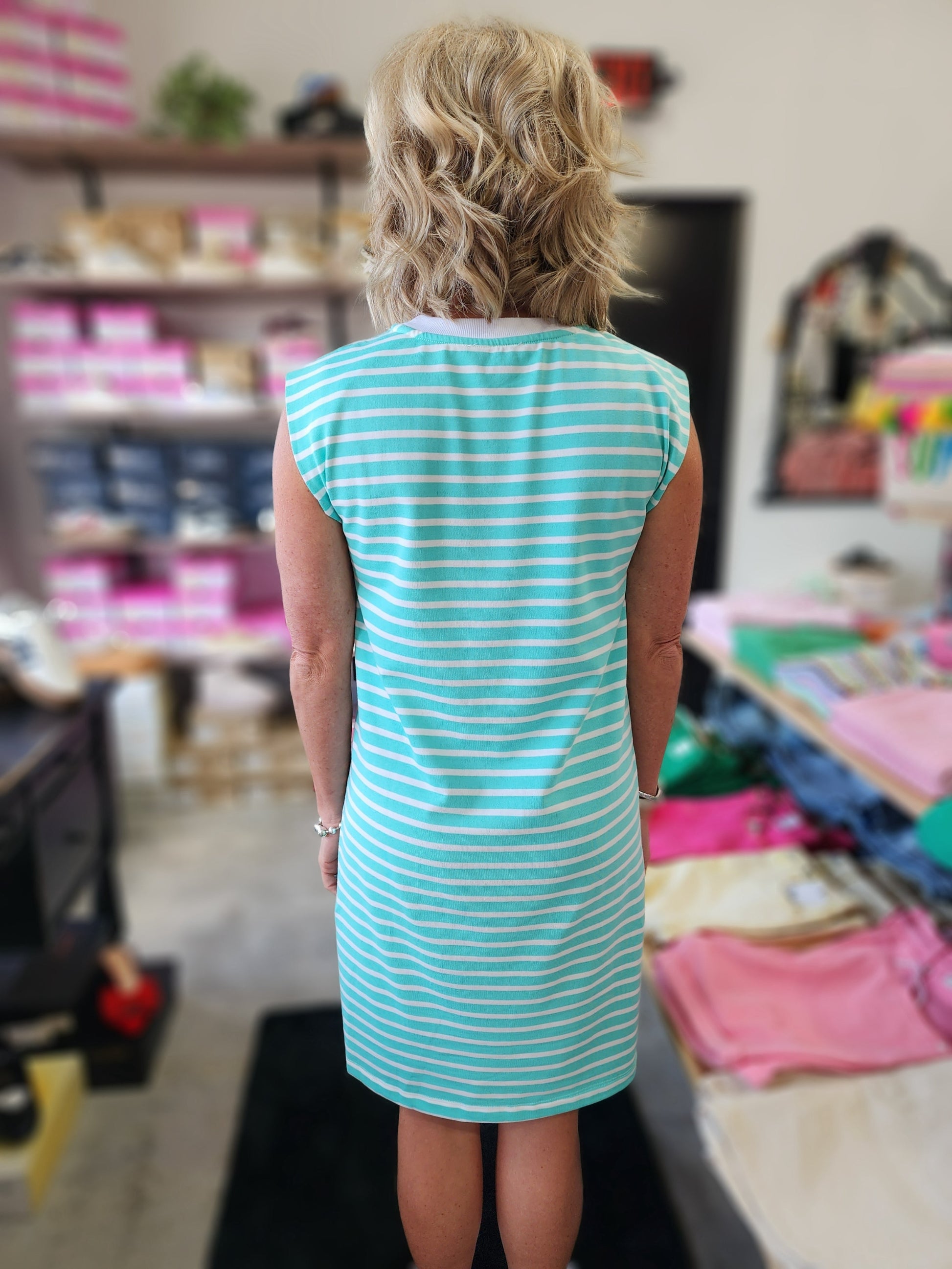 The Mint To Be Dress combines comfort and style with its sleeveless, mini shift design crafted from soft French terry fabric. Its refreshing mint hue paired with white stripes and a classic crew neck creates a versatile look perfect for sunny days or casual gatherings. Lightweight and breathable, this dress ensures you stay cool while looking effortlessly chic.