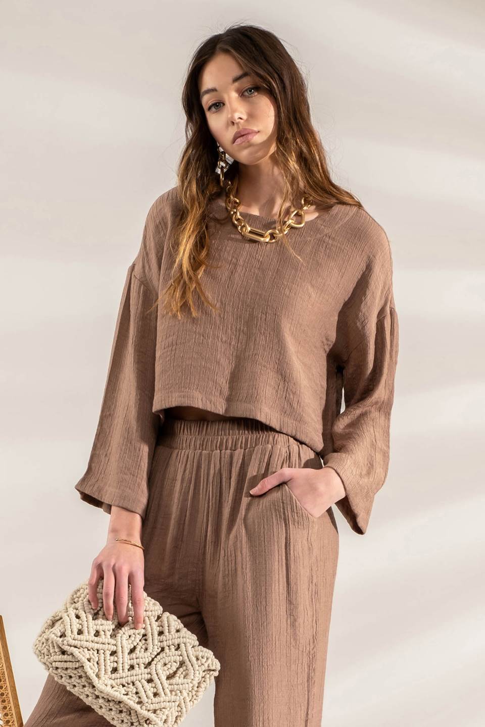 Introducing The Nellie Top – a modern update of the classic long sleeve top. Crafted from lightweight fabric, this piece features a wide U neckline, extended shoulders, and a cropped body. Perfect for layering or wearing alone. Dress it up or down for any occasion.
