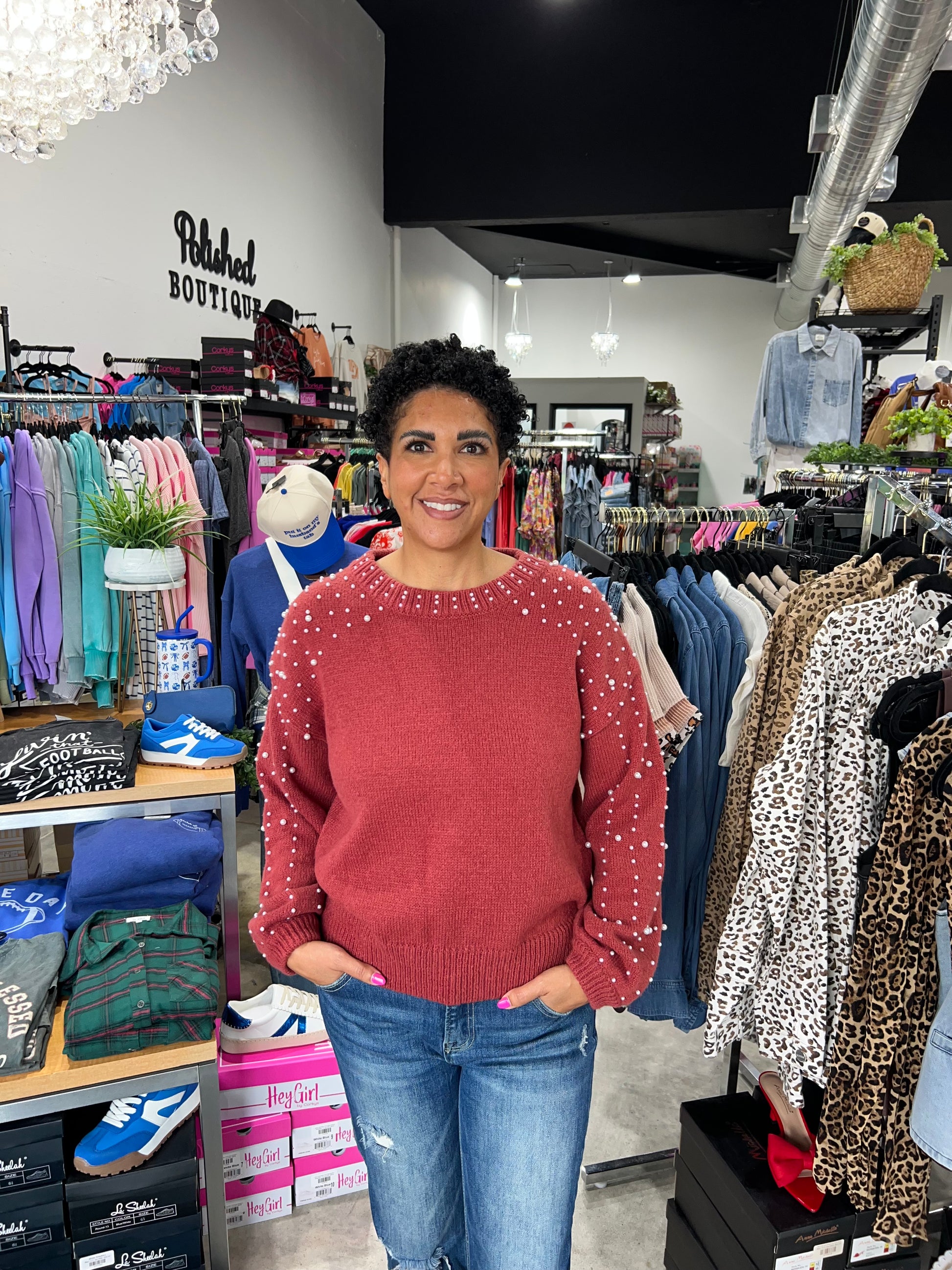 The Pearl Sweater features balloon sleeves adorned with delicate pearls, adding a festive and trendy touch to your wardrobe. Its comfortable crew neck design makes it perfect for celebrating special occasions or brightening up everyday looks with a fun, stylish flair. Embrace a chic and joyful vibe with this beautifully embellished sweater.