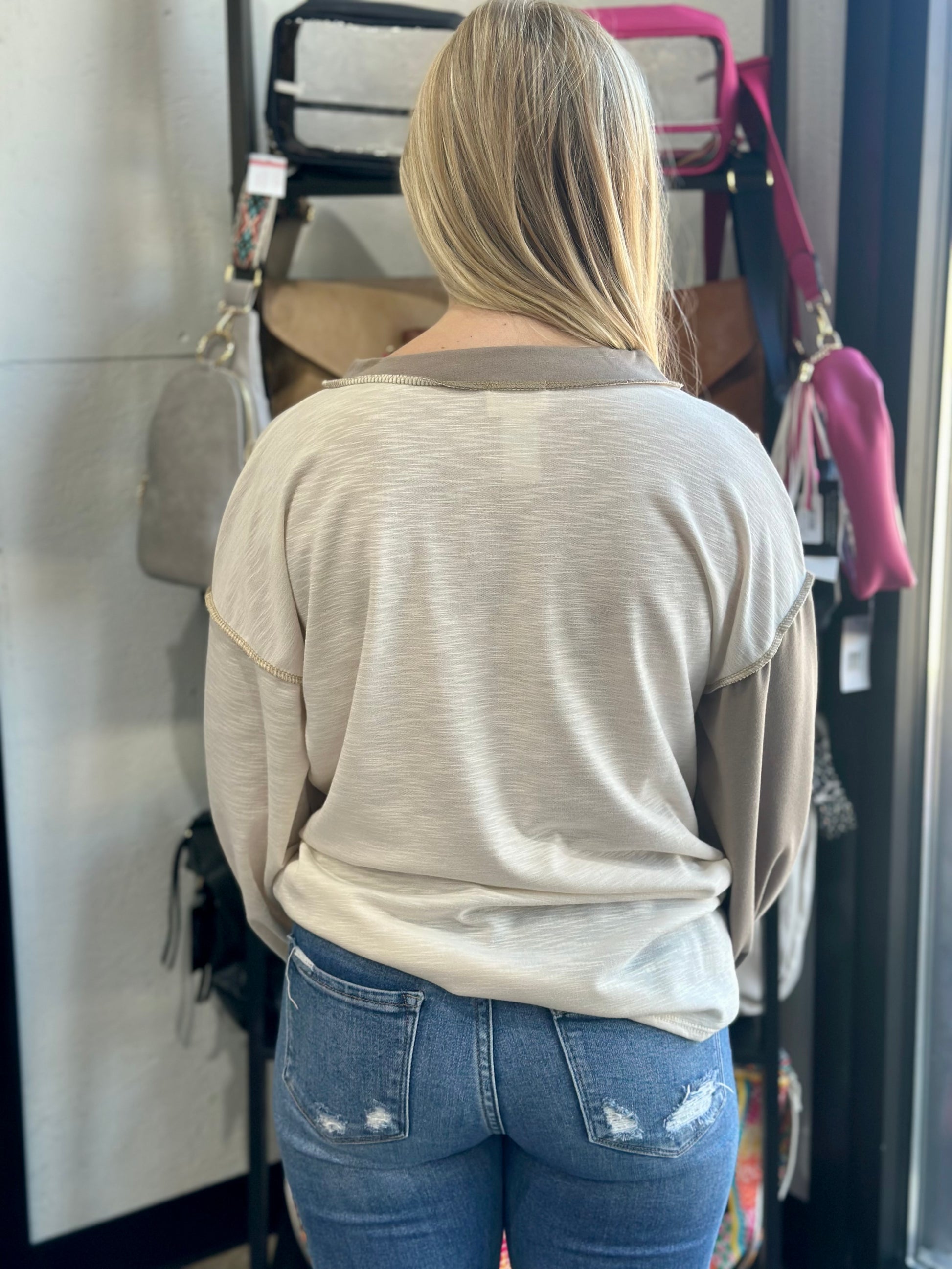 This Penny Color Block Top is designed with the perfect combination of style and comfort. Featuring a v-neckline, long sleeve and a unique color block of sand, mocha and mustard, this top is sure to be an essential in any wardrobe. Crafted with terry stitched fabric for ultimate comfort, this top will bring you style with ease.