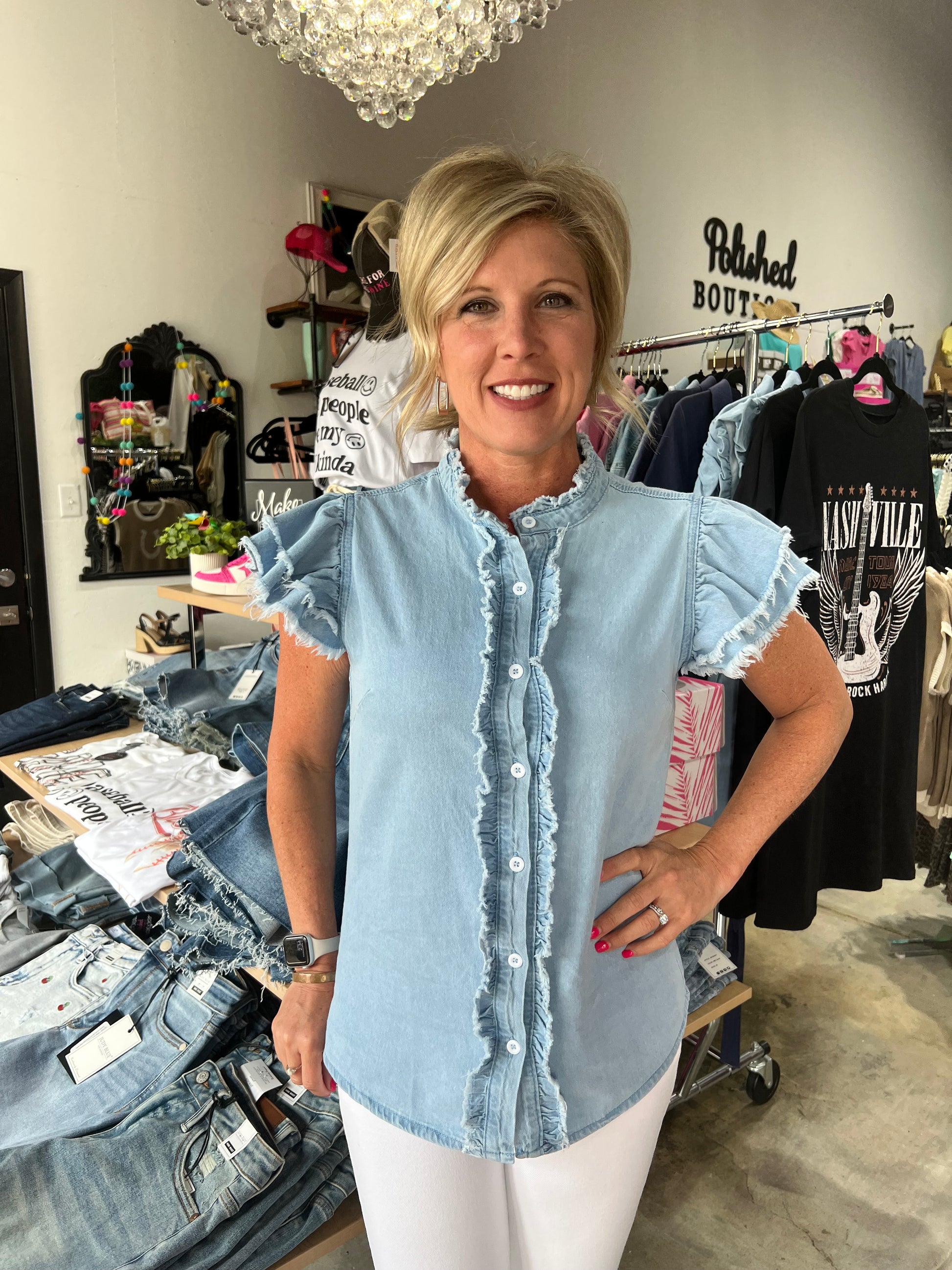 Elevate your wardrobe with The Perfect Frayed Denim Top, featuring playful ruffled trim and a classic button-down design. This trendy piece effortlessly blends cute and fun style, making it ideal for dressing up with accessories or keeping it casual for everyday wear. Versatile and chic, it’s the go-to top to refresh your look with ease.