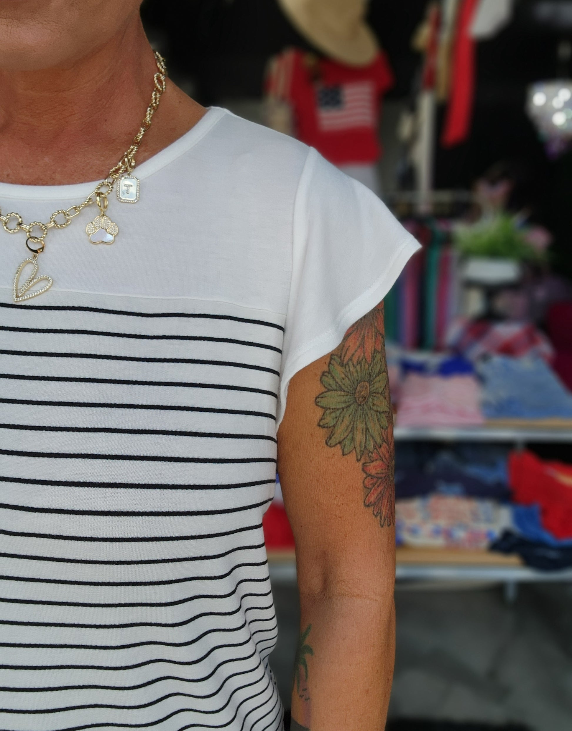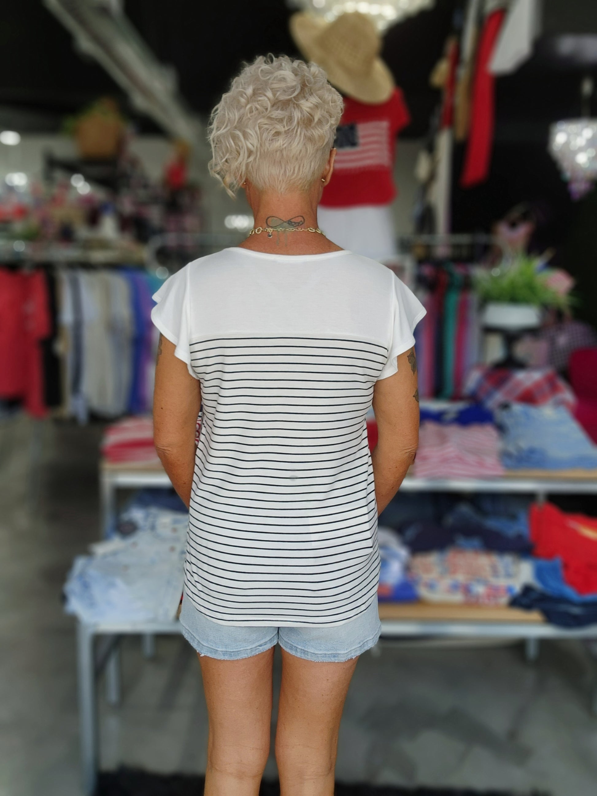 The Pinstripe Flutter Top features a flattering round neck and delicate flutter sleeves, combining comfort with style. Its classic white fabric with black stripes makes it versatile enough to dress up for a polished look or dress down for casual days. This top is designed to effortlessly complement your wardrobe, offering both ease and elegance for any occasion.