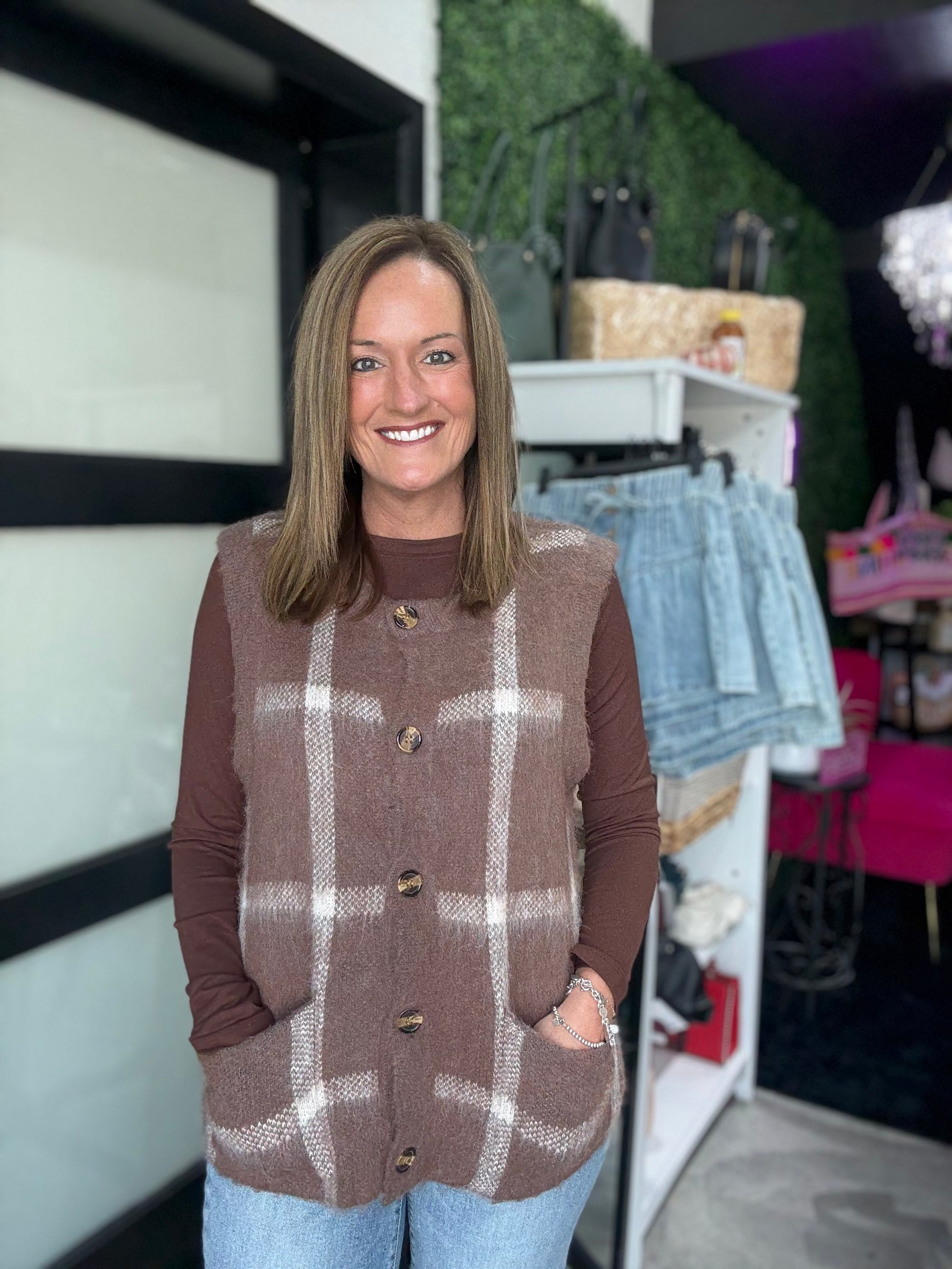 This cozy and classic sweater vest is crafted from a soft, fuzzy knit, offering a plush and inviting texture. It features a timeless windowpane plaid pattern, adding a touch of rustic charm to the design. The vest is styled with a simple round neckline, a front closure adorned with large, handsome tortoise-shell buttons, and two functional patch pockets at the front. Perfect for layering over a simple top or turtleneck, this piece adds both warmth and a layer of sophisticated, textural style to any casual look.